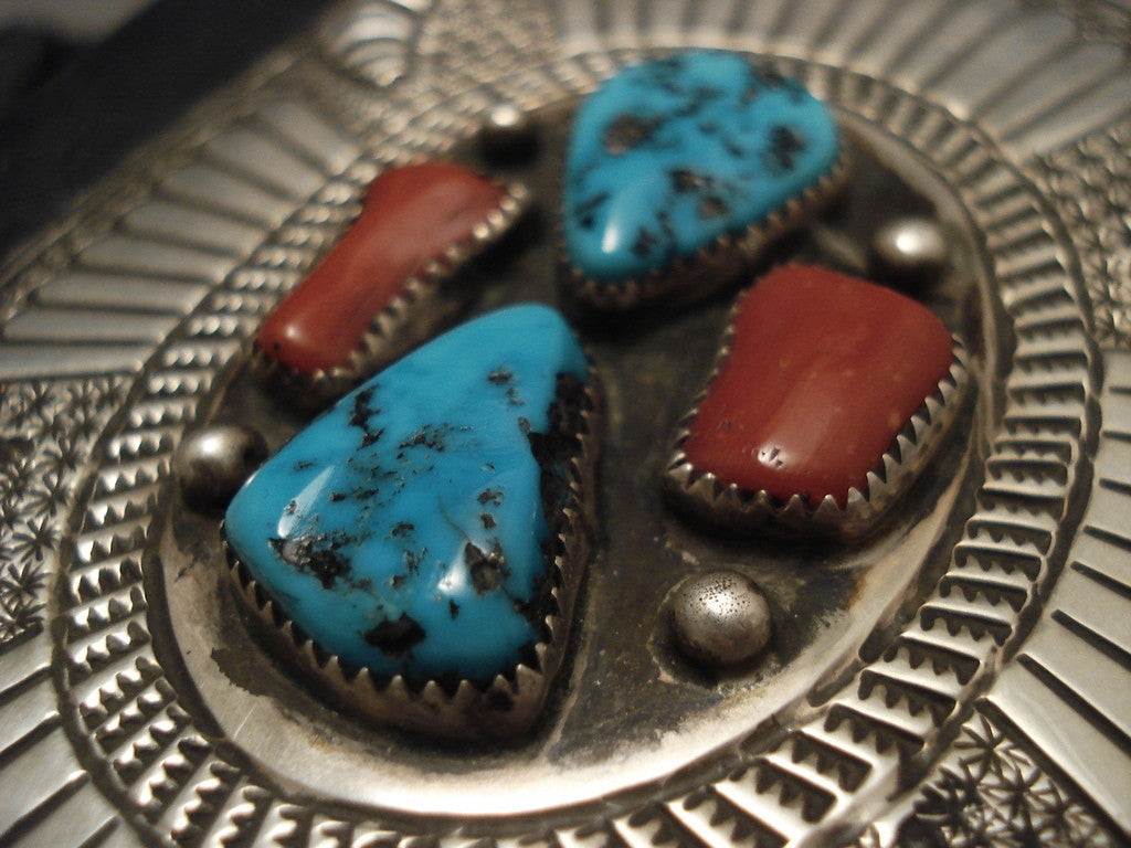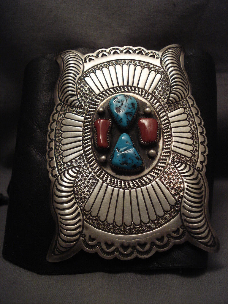 This is an impressive vintage Navajo museum quality huge hand carved silver bow guard having an enormous silver plate that contains hand repoussed silver shells. Situated around the piece are phenomenal silver works which include amazing silver sun works, teepees, fans and star patterns. Resting in the center of the silver plate are exquisite Old Kingman turquoise stones with accenting coral stones. The width of this ketoh bracelet measures around 4-3/4" and this piece will fit a wrist size of about 8-1/2" X 9-1/2". The largest stone measures around 3/4" x 1/2". Purchased from Navajo artist, Yazzie Family . Sterling silver. Cir. 1960's+. Sturdy 114 grams. MAKE US AN OFFER- We like to be flexible! Send us your reasonable offer on this piece(s), you have nothing to lose. The most common email we receive is from buyers who waited too long and someone bought it before they did. LAYAWAYS- Please contact us prior to purchasing and we can work out an easy 0%-interest Paypal/ Money Order lay-a-way plan that fits your budget. (Item must be of $100 value or more).