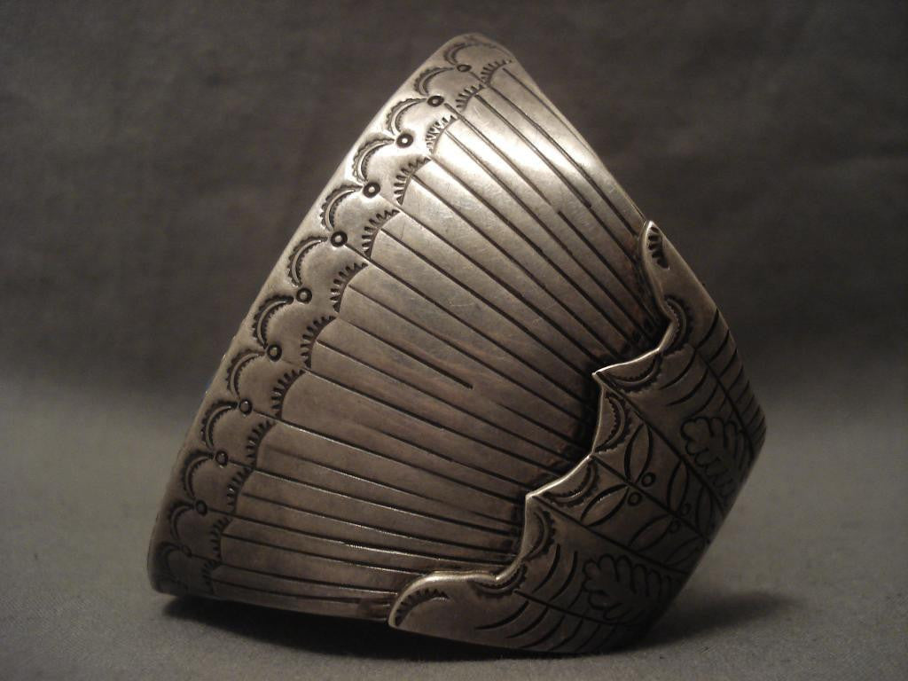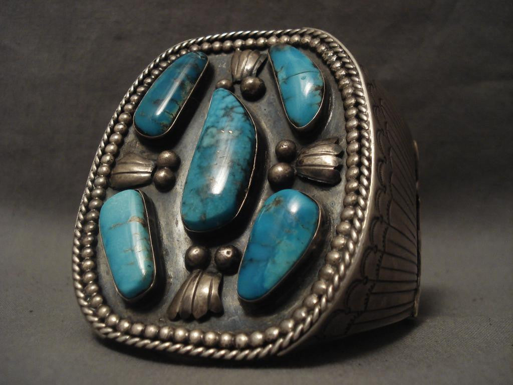 This is a tremendous vintage Navajo museum quality silver bracelet being one of the finest Blue Diamond turquoise pieces we have ever seen! This piece contains five gigantic Blue Diamond turquoise stones that rest with wonderful hand carved silver fans and unique bordering beads and ropes. Notice how precise and large the silver flanks are which contain a second flank that rests on the ends. These flanks are incredibly detailed with impeccable silver leaves and marvelous waves. This is one of the finest flank bracelets we have ever seen. This bracelet consists of incredible patina. The center stone measures around 1-3/8" x 1/2". The width of the bracelet measures around 3-1/4". Sterling silver. Cir. 1980's+. The inside end to end measures around 5-3/4" with an additional 1-1/4" gap. Sturdy 160 grams. MAKE US AN OFFER- We like to be flexible! Send us your reasonable offer on this piece(s), you have nothing to lose. The most common email we receive is from buyers who waited too long and someone bought it before they did. LAYAWAYS- Please contact us prior to purchasing and we can work out an easy 0%-interest Paypal/ Money Order lay-a-way plan that fits your budget. (Item must be of $100 value or more).