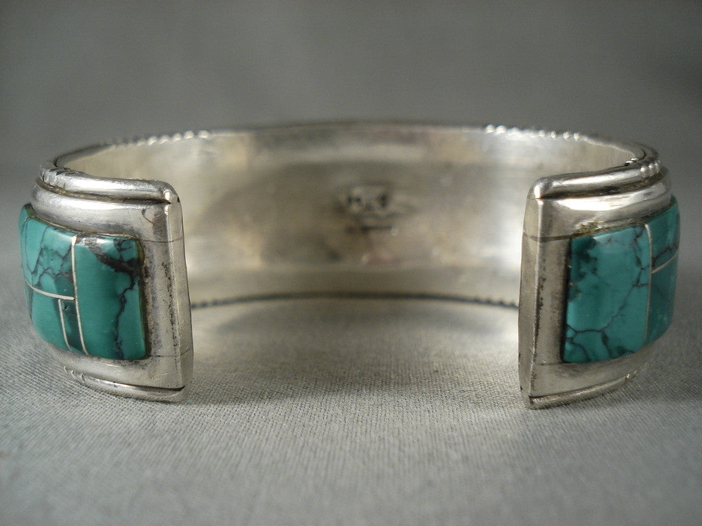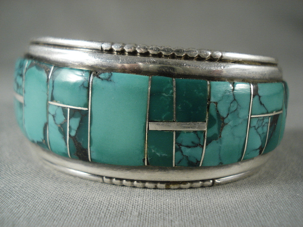 An exquisite vintage Navajo silver bracelet. Geometric inlay designwork of intense green Spiderweb turquoise stones make up the raised center portion of this thick silver cuff. Dual borders of simplistic silver bar and the outer with stations of occasional teeth design really draw your attention to the beautiful inlay work of these stones! The width of the bracelet measures around 1". Signed by Navajo artist, S. Tso. Sterling silver, marked. Cir. 1980's+. The inside end to end measures around 5-7/8" with an additional 1-1/4" gap. Sturdy 98 grams. LAYAWAYS- We are happy to work with you and are more flexible than anyone on the net. Simply send us an email for more information.Make Us an Offer- Due to the high demand of our items, many pieces sell quite fast. The most frequent email we receive are from buyers who waited too long to make us an offer and suddenly lost out because another buyer came in and purchased. Send us your reasonable offer today, we are flexible and you have nothing to lose! We also have layaway available and are happy to work with you. Send us an email for more details. Ahéhee’ (Thank you)