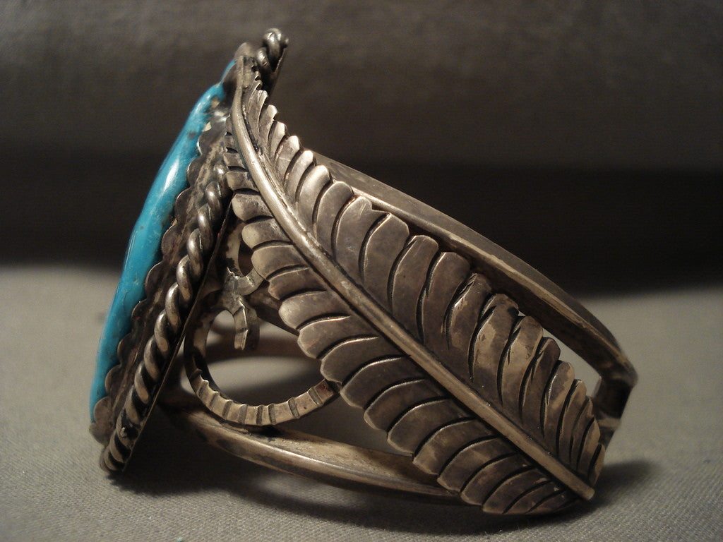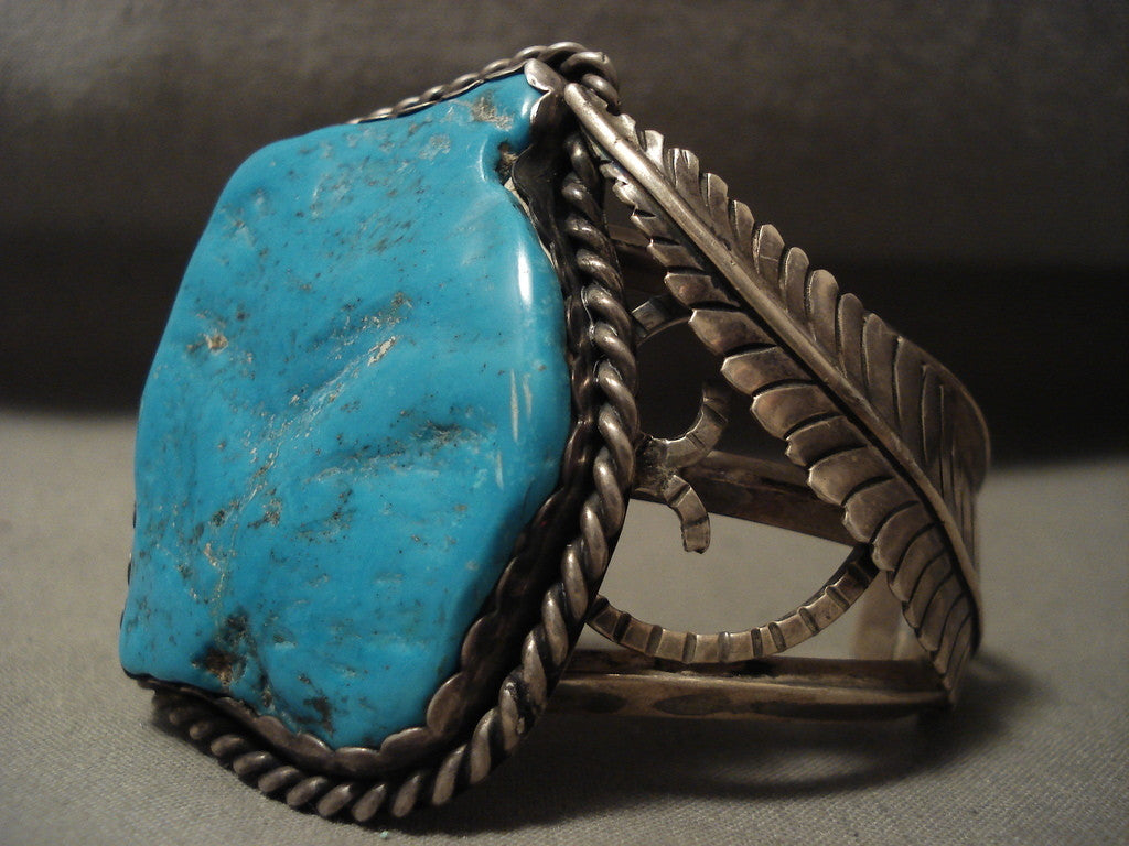 This is a breathtaking vintage Navajo silver bracelet. This piece contains a huge center turquoise nugget stone that has a wonderful deep blue coloration. Resting at the sides of the stone are colossal hand carved silver leaves. Situated underneath the leaves are marvelous swirling silver patterns. This piece is absolutely beautiful. The bracelet consists of an amazing triple silver shank cuff. The height at the center of the bracelet measures around 2" and the width at the center of the cuff measures around 1-3/8". The center stone measures around 1-5/8" x 1-1/2". Sterling silver. Cir. Mid century . The inside end to end measures around 5" with an additional 1-1/4" gap. Sturdy 73 grams. LAYAWAYS- We are happy to work with you and are more flexible than anyone on the net. Simply send us an email for more information.Make Us an Offer- Due to the high demand of our items, many pieces sell quite fast. The most frequent email we receive are from buyers who waited too long to make us an offer and suddenly lost out because another buyer came in and purchased. Send us your reasonable offer today, we are flexible and you have nothing to lose! We also have layaway available and are happy to work with you. Send us an email for more details. Ahéhee’ (Thank you)