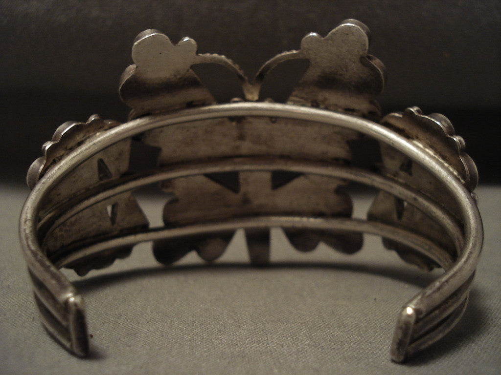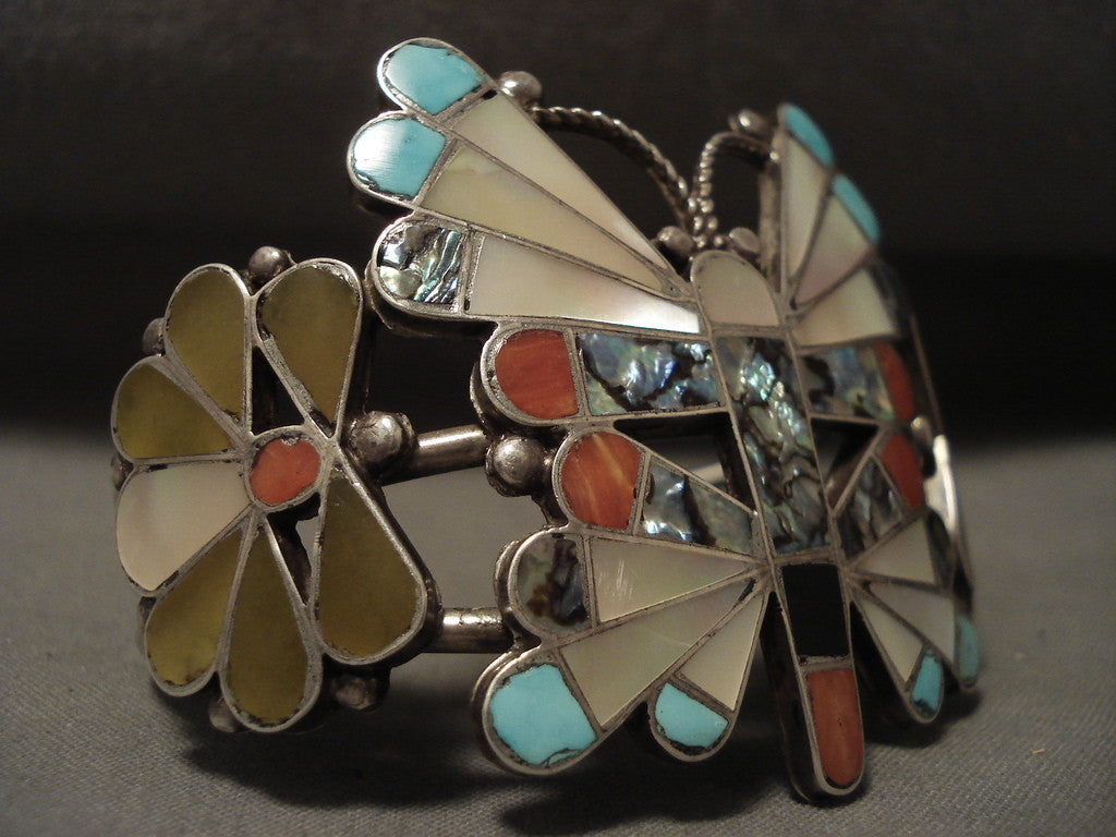 This is an incredible vintage Zuni silver inlaid butterfly bracelet being one of the best and oldest butterfly bracelets we have ever seen. This bracelet is huge with the large center butterfly measuring around 1-7/8" X 1-7/8". The remarkable inlay consists of natural abalone, natural turquoise, and natural coral. This wonderful bracelet consists of a stunning triple silver shank cuff. The width of the bracelet measures around 1". Sterling silver. Cir. 1930's+. The inside end to end measures around 5" with an additional 1-1/2" gap. Sturdy 53 grams. LAYAWAYS- We are happy to work with you and are more flexible than anyone on the net. Simply send us an email for more information.Make Us an Offer- Due to the high demand of our items, many pieces sell quite fast. The most frequent email we receive are from buyers who waited too long to make us an offer and suddenly lost out because another buyer came in and purchased. Send us your reasonable offer today, we are flexible and you have nothing to lose! We also have layaway available and are happy to work with you. Send us an email for more details. Ahéhee’ (Thank you)