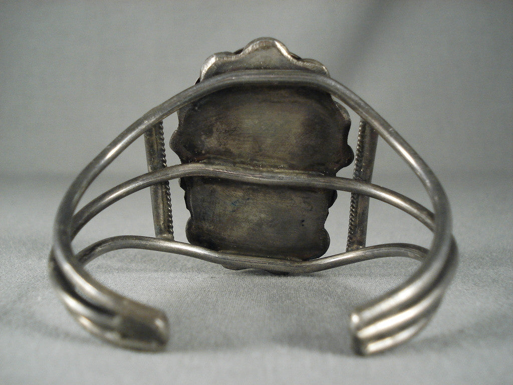 A tremendous vintage Navajo silver bracelet. This wonderful bracelet boasts the most breathtaking stones of spiderweb turquoise and coral - one more stunning than the other! The stones are set one above the other, as silver applique accents of leaves, stamped beads, rope and arched links have all come together to make a most fabulous platform that's placed upon its widely split triple rail cuff, while guarded at either side with a vertical silver bar. The largest stone measures around 1-1/8" x 7/8". The width of the bracelet measures around 2". Signed by Navajo artist, M. Yazzie. Sterling silver. Cir. 1950's+. The inside end to end measures around 5-1/2" with an additional 1" gap. Sturdy 48 grams. LAYAWAYS- We are happy to work with you and are more flexible than anyone on the net. Simply send us an email for more information.Make Us an Offer- Due to the high demand of our items, many pieces sell quite fast. The most frequent email we receive are from buyers who waited too long to make us an offer and suddenly lost out because another buyer came in and purchased. Send us your reasonable offer today, we are flexible and you have nothing to lose! We also have layaway available and are happy to work with you. Send us an email for more details. Ahéhee’ (Thank you)