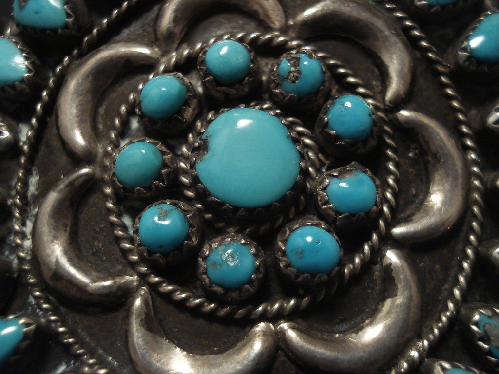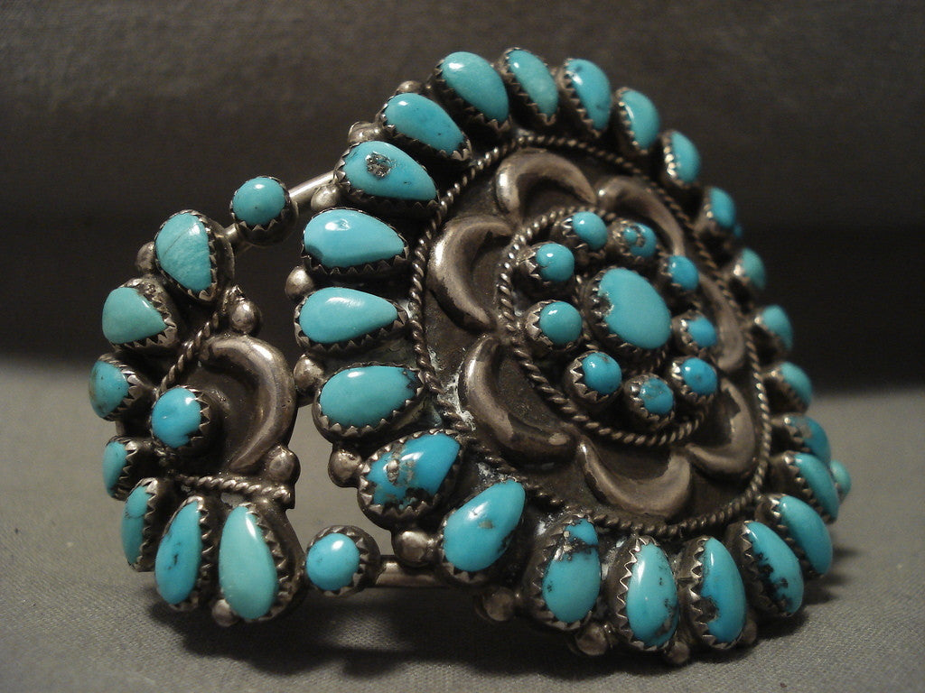 This is a magnificent vintage Navajo museum quality silver cluster bracelet. Located on the bracelet are marvelous teardrop and round shaped natural blue turquoise stones appearing to have originated from the Morenci mine. Surrounding the center cluster of stones are impeccable repoussed silver waving patterns with ropes and beads. This bracelet includes a striking rounded triple silver shank cuff. The center stone measures around 1/4" x 1/4". The width of the bracelet measures around 1-5/8". Sterling silver. The inside end to end measures around 5-1/2" with an additional 1-1/2" gap. Sturdy 68 grams. LAYAWAYS- We are happy to work with you and are more flexible than anyone on the net. Simply send us an email for more information.