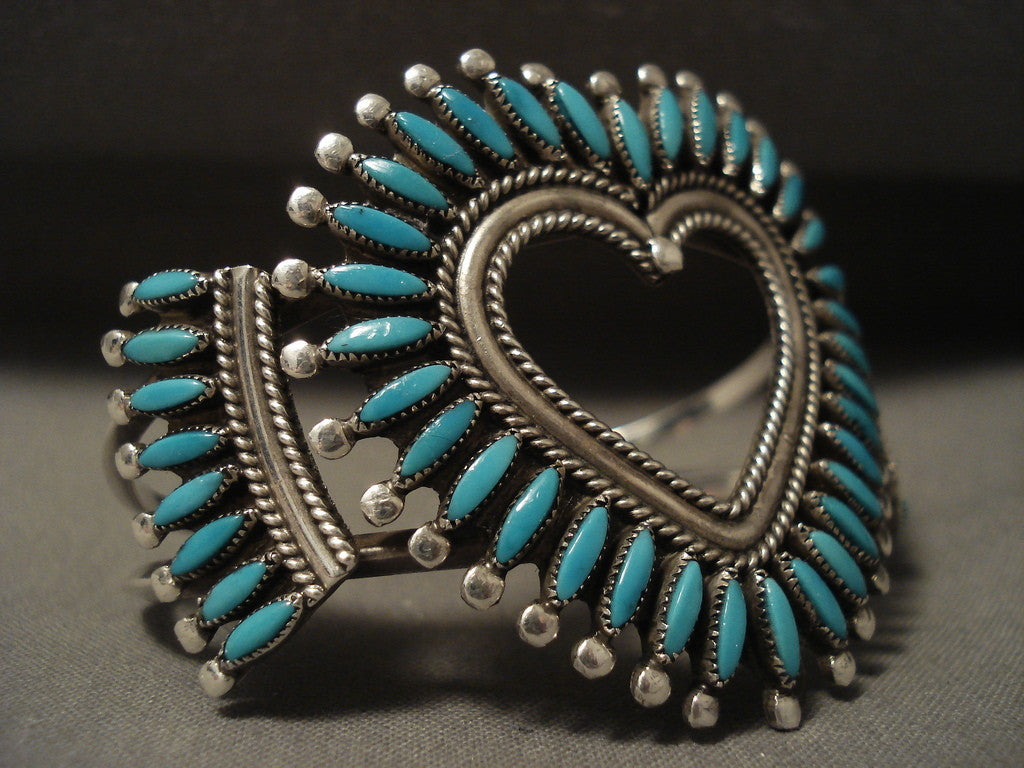 This is a remarkable vintage Zuni museum quality silver bracelet. This piece contains a beautiful center heart formation made out of breathtaking natural needlepoint turquoise stones. Bordering the stones are wonderful silver raindrops with accenting silver ropes. This bracelet consists of a stunning double silver shank cuff. The heart measures around 2" X 1-3/4". The width at the center of the cuff measures around 1". Signed by Zuni artist, Osade. Sterling silver. Cir. 1950's+. The inside end to end measures around 5" with an additional 1" gap. Sturdy 26 grams. LAYAWAYS- We are happy to work with you and are more flexible than anyone on the net. Simply send us an email for more information.