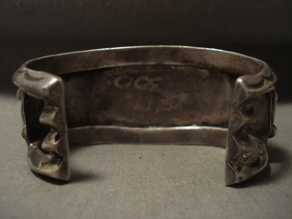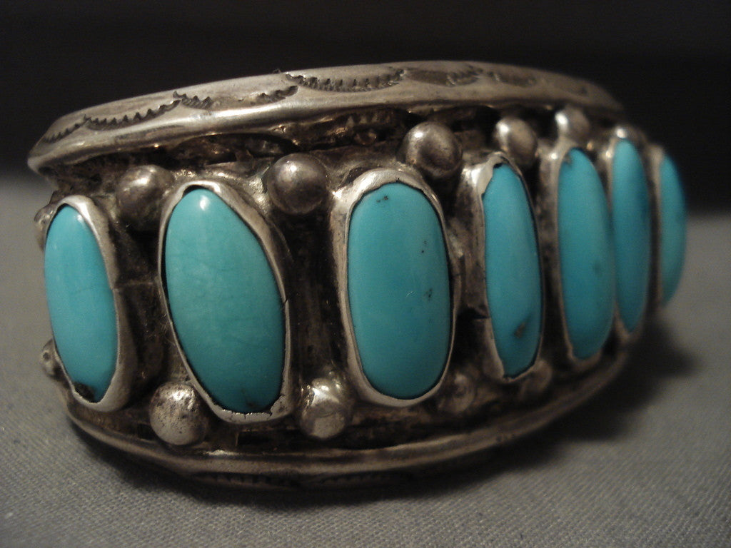 This is a magnificent vintage Navajo museum quality silver row bracelet. This piece contains 9 graduating natural high grade old Sleeping Beauty turquoise stones. The stones are incredibly wonderful. Check out the imrpessive open channels near the ends of the bracelet. Situated throughout the bracelet are amazing silver raindrops with accenting silver sun patterns that border the cuff. The center stone measures around 3/4" x 1/4". The width of the bracelet measures around 1-3/8". Sterling silver, marked. The inside end to end measures around 5-1/4" with an additional 1-1/2" gap. Sturdy 91 grams. LAYAWAYS- We are happy to work with you and are more flexible than anyone on the net. Simply send us an email for more information.Make Us an Offer- Due to the high demand of our items, many pieces sell quite fast. The most frequent email we receive are from buyers who waited too long to make us an offer and suddenly lost out because another buyer came in and purchased. Send us your reasonable offer today, we are flexible and you have nothing to lose! We also have layaway available and are happy to work with you. Send us an email for more details. Ahéhee’ (Thank you)