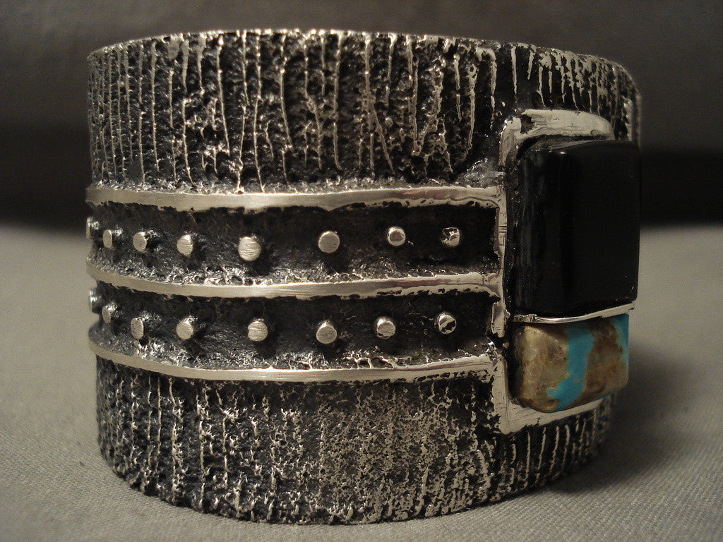 This is a museum quality vintage Navajo geometric silver bracelet. This piece contains a huge geometric tufa casted pattern which runs into Number 8 and onyx stones. Surrounding the geometric patterns and tufa cast cuff are fabulous dotted silver works. The turquoise stone measures around 3/8" X 1/4" and the onyx stone measures around 1/2" X 3/8". The width of the bracelet measures around 1-1/2". Signed by Navajo artist, Stu Billie . Sterling silver, marked. The inside end to end measures around 5" with an additional 1" gap. Sturdy 123 grams. LAYAWAYS- We are happy to work with you and are more flexible than anyone on the net. Simply send us an email for more information.