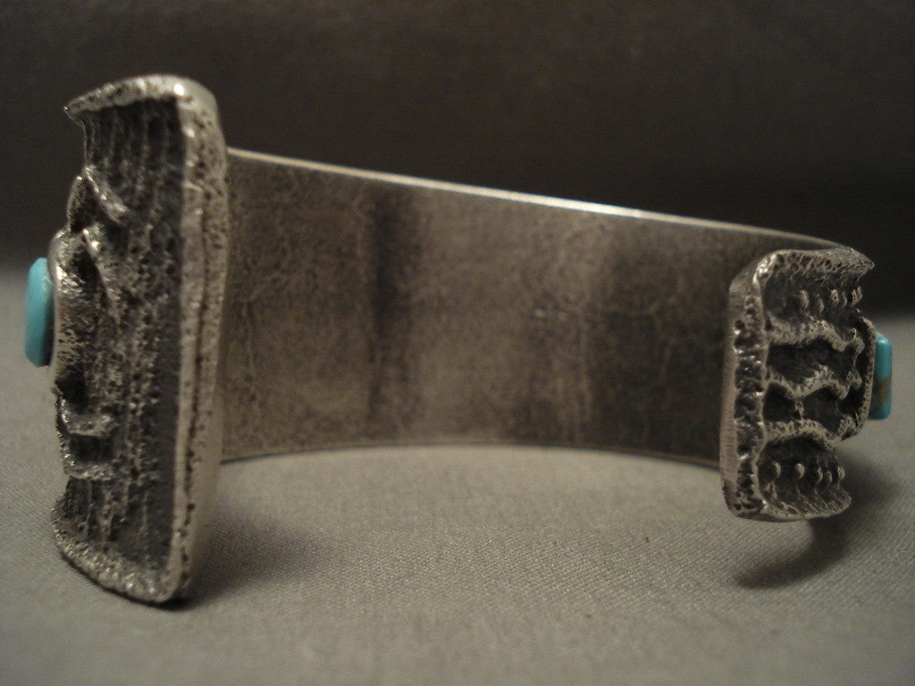 This is a museum quality vintage Navajo tufa cast silver bracelet. This piece contains wonderful geometric patterns with a stunning huge antelope figure on one end. Check out that Number 8 turquoise that beautifully runs down one end of the cuff with a fabulous accenting coral stone. It is rare to find Number 8 in square shape. The cuff graduates in size with the smallest end measuring around 3/4" and the largest end measuring around 1-1/2". This is a very heavy silver bracelet. The largest stone measures around 5/8" x 3/8". Signed by Navajo artist, Stuart Billie . Sterling silver, marked. The inside end to end measures around 5-3/4" with an additional 1-1/2" gap. Sturdy 120 grams. LAYAWAYS- We are happy to work with you and are more flexible than anyone on the net. Simply send us an email for more information.