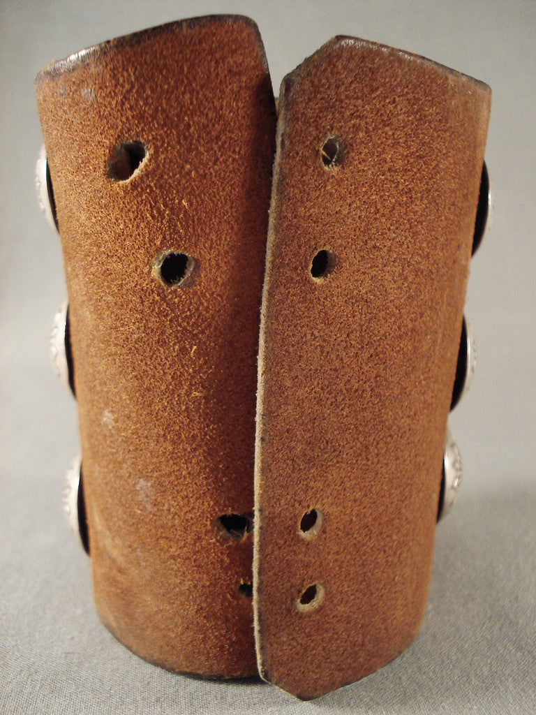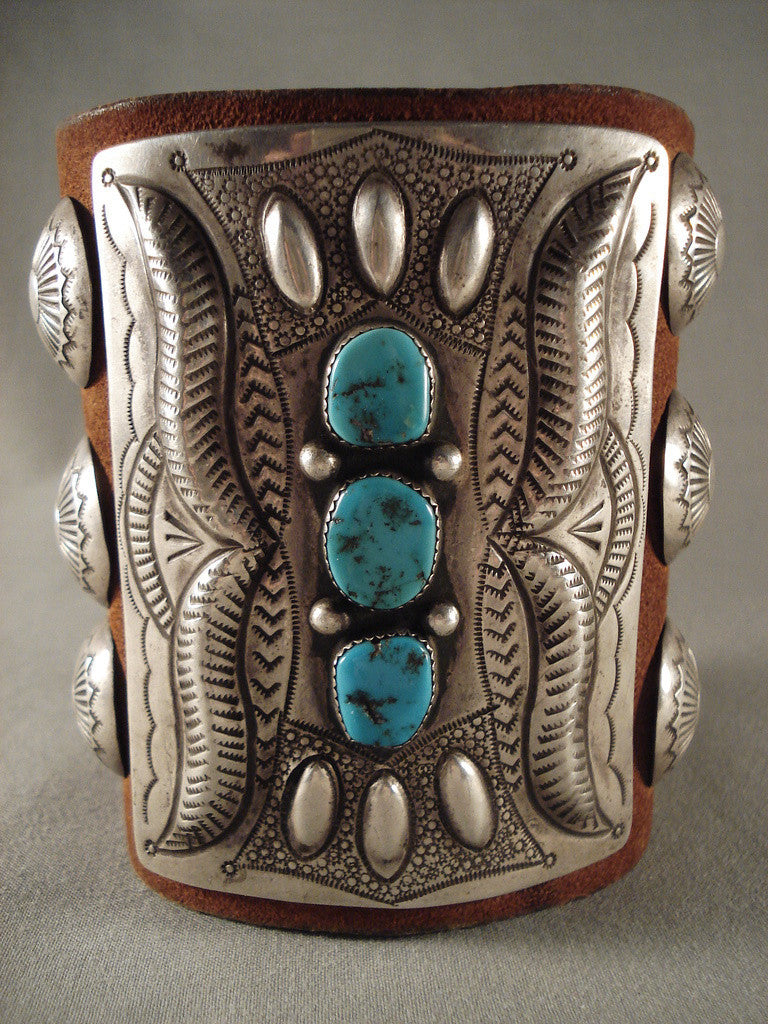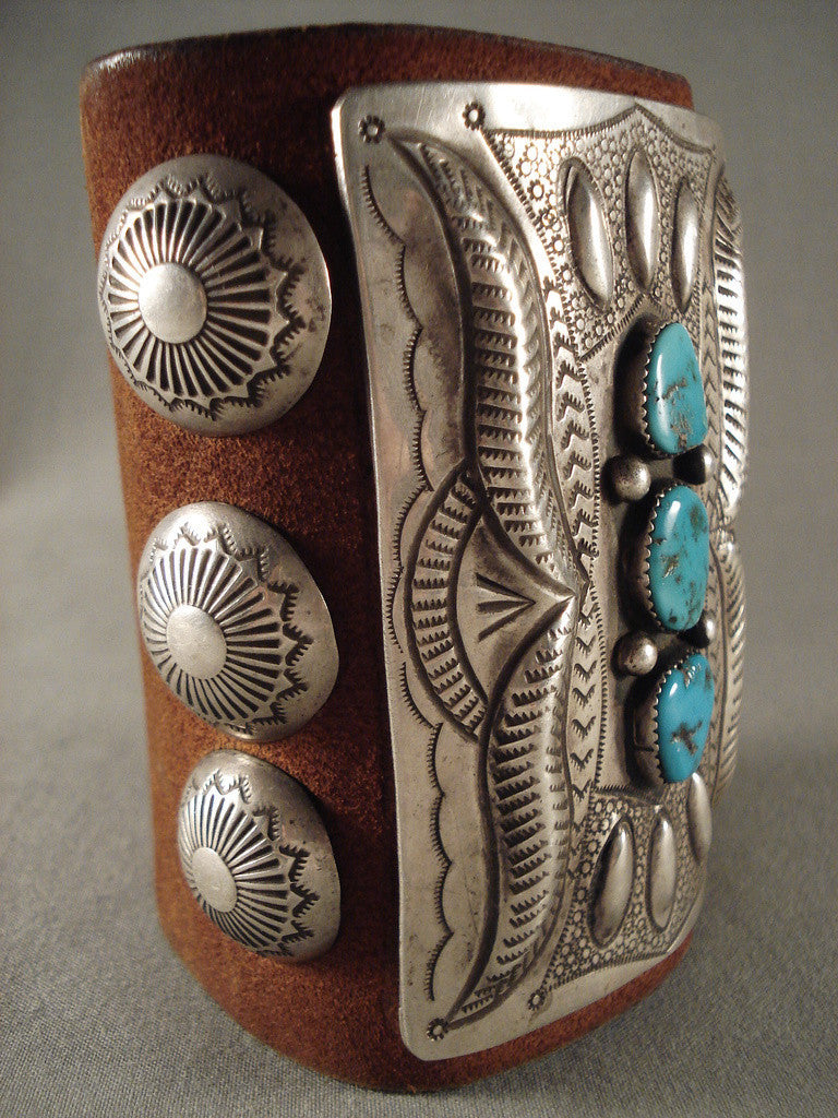 This is a tremendous vintage Navajo silver bowguard. The rectangular front silver panel measures about 3-5/8" x 2-3/4" and has three large Blue Gem turquoise stones set one atop the other, separated with dual silver beads. They're surrounded with awesome repousse torpedo shapes at the north and south and large hand stamped wings at the east and west sides. Amidst the repousse work are hand stamped mini suns, clouds and arrow designs. At either side of the front panel are triple stacked 1" silver buttons with their own marelous hand stamped sunburst designs. The brown leather bowguard measures about 4" x 9" end to end. The center stone measures around 5/8" x 1/2". Signed by Navajo artist, Larry Smith. Sterling silver. Cir. 1970's+. Sturdy 114 grams. MAKE US AN OFFER- We like to be flexible! Send us your reasonable offer on this piece(s), you have nothing to lose. The most common email we receive is from buyers who waited too long and someone bought it before they did. LAYAWAYS- Please contact us prior to purchasing and we can work out an easy 0%-interest Paypal/ Money Order lay-a-way plan that fits your budget. (Item must be of $100 value or more).