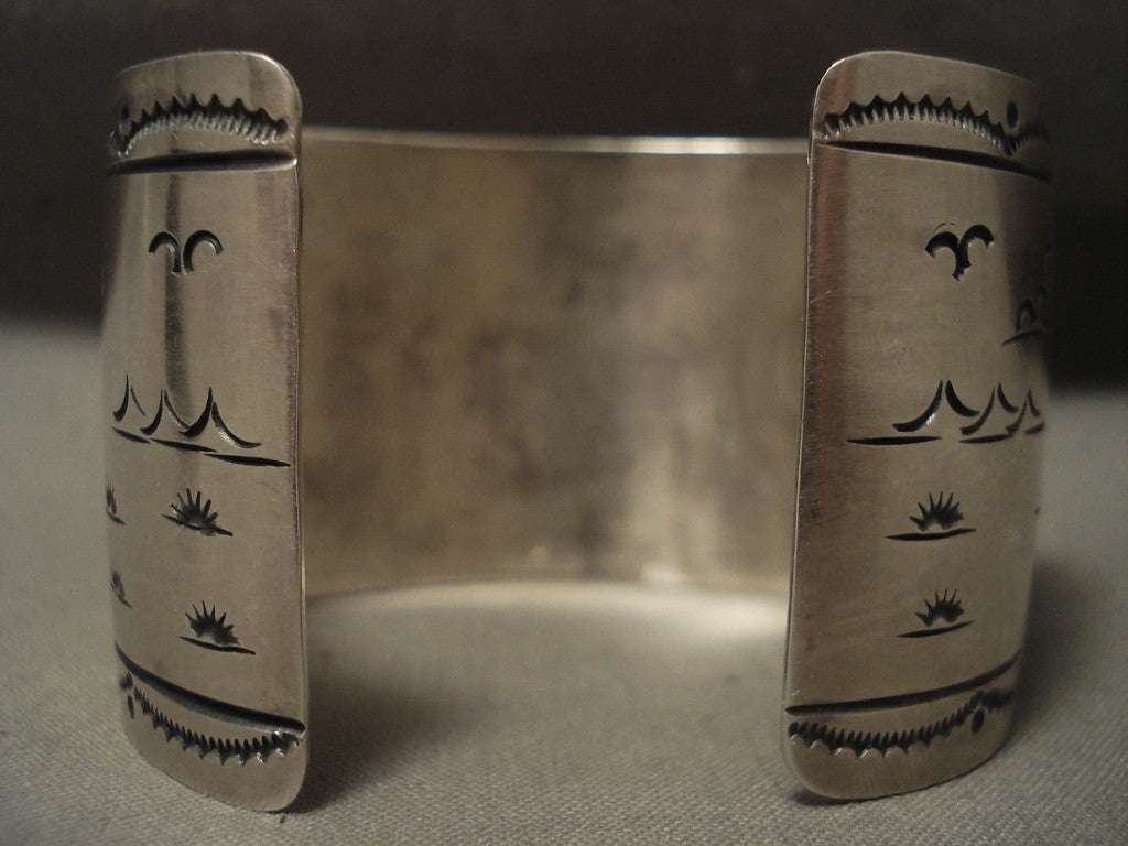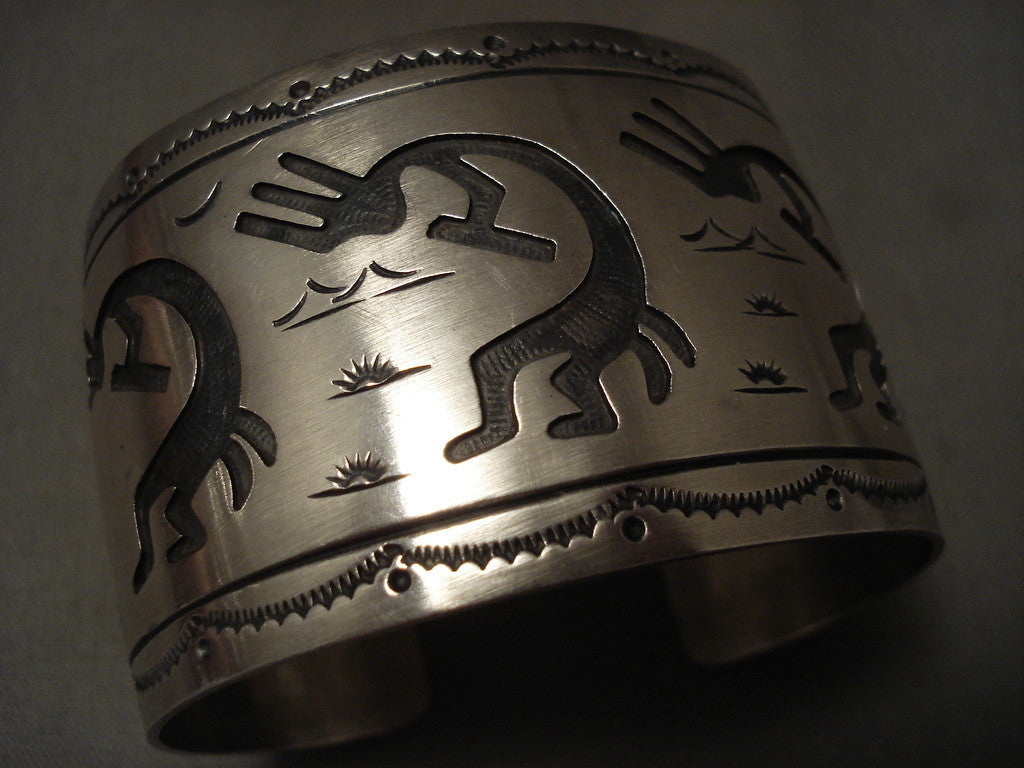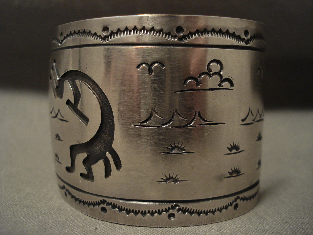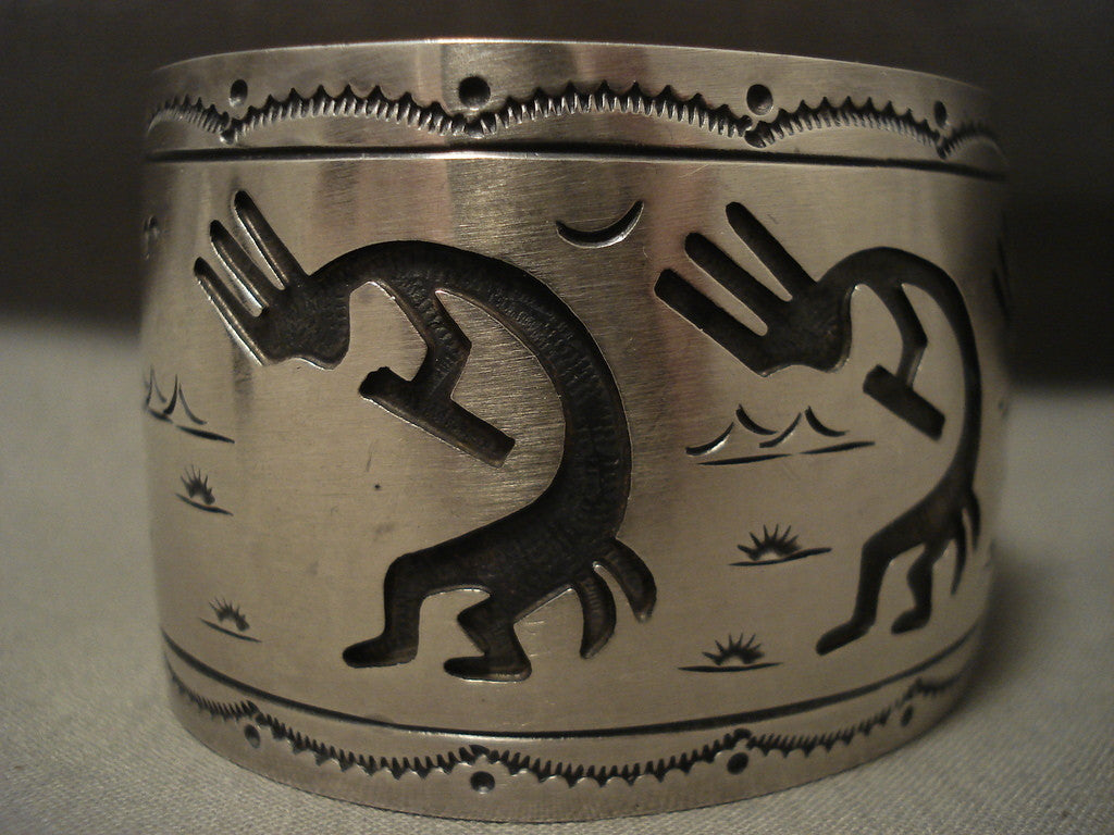 This is an exceptional vintage Hopi/ Navajo very wide all silver kokopelli bracelet. This piece contains three amazingly huge dancing kokopellis in the center with surrounding mountain and cloud patterns. Bordering the very wide silver cuff are outstanding silver sun patterns. The silver works on this bracelet are just incredible and completely intricate. The width of the bracelet measures around 1-1/2". Signed by Hopi/ Navajo artist B. Sterling silver, marked. Cir. Mid to late 20th century . The inside end to end measures around 6" with an additional 1" gap. Sturdy 56 grams. LAYAWAYS- We are happy to work with you and are more flexible than anyone on the net. Simply send us an email for more information.