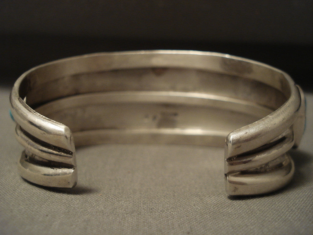 This is a breathtaking vintage Navajo museum quality silver bracelet. This piece carries 5 remarkable Old Kingman turquoise stones. Surrounding the stones are wonderful handmade silver shells. Bordering the cuff are impressive silver plant and sun patterns. This bracelet includes a triple silver shank cuff. The center stone measures around 3/4" x 1/2". The width of the bracelet measures around 1-1/4". Signed by Navajo artist, J. F. (unique font). Sterling silver, marked. Cir. 1950's+. The inside end to end measures around 5-3/4" with an additional 1" gap. Sturdy 62 grams. LAYAWAYS- We are happy to work with you and are more flexible than anyone on the net. Simply send us an email for more information.Make Us an Offer- Due to the high demand of our items, many pieces sell quite fast. The most frequent email we receive are from buyers who waited too long to make us an offer and suddenly lost out because another buyer came in and purchased. Send us your reasonable offer today, we are flexible and you have nothing to lose! We also have layaway available and are happy to work with you. Send us an email for more details. Ahéhee’ (Thank you)
