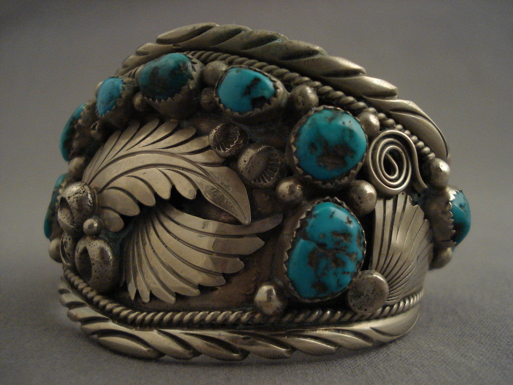 This is a wonderful vintage Navajo silver bracelet having 12 Old Kingman turquoise stones arching over handmade silver beads, fans and handcarved silver leaves, stems and berries! The bracelet has handcarved silver borders that decrease down to the terminal ends on the solid silver cuff! Simply Beautiful! The largest silver leaf measures about 1-3/8" X 5/8". Large silver berries each measure around 1/4" X 1/4". The largest stone measures around 1/2" x 3/8". The width of the bracelet measures around 1-7/8". Signed by Navajo artist, Lew Brown. Sterling silver. Cir. 1980's+. The inside end to end measures around 5-1/4" with an additional 1" gap. Sturdy 65 grams. MAKE US AN OFFER- We like to be flexible! Send us your reasonable offer on this piece(s), you have nothing to lose. The most common email we receive is from buyers who waited too long and someone bought it before they did. LAYAWAYS- Please contact us prior to purchasing and we can work out an easy 0%-interest Paypal/ Money Order lay-a-way plan that fits your budget. (Item must be of $100 value or more).
