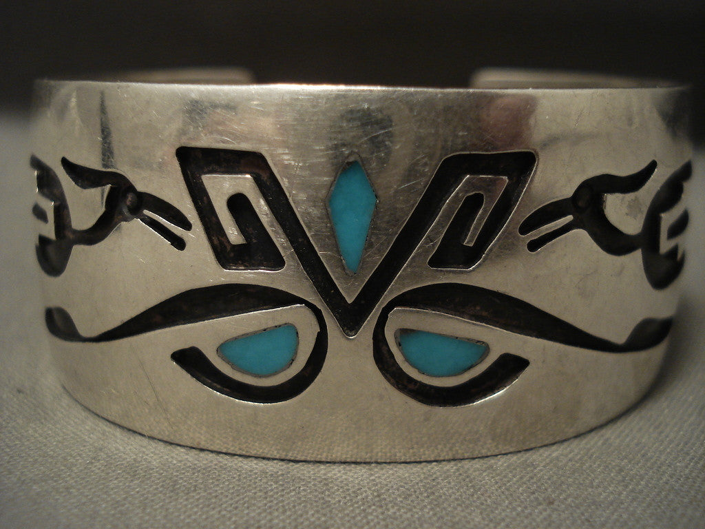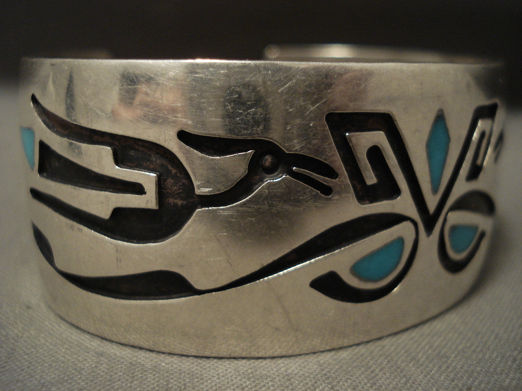 This is a breathtaking vintage Hopi/ Navajo inlaid silver bracelet. This piece contains five marvelous inlaid turquoise stones with two huge hand carved silver birds on each end. The silver works on this bracelet is absolutely phenomenal as is the stunning turquoise. The width of the bracelet measures around 1". Signed by Hopi/ Navajo artist W. . Sterling silver, marked. Cir. Mid to late century . The inside end to end measures around 5-1/4" with an additional 1" gap. Sturdy 38 grams. LAYAWAYS- We are happy to work with you and are more flexible than anyone on the net. Simply send us an email for more information.Make Us an Offer- Due to the high demand of our items, many pieces sell quite fast. The most frequent email we receive are from buyers who waited too long to make us an offer and suddenly lost out because another buyer came in and purchased. Send us your reasonable offer today, we are flexible and you have nothing to lose! We also have layaway available and are happy to work with you. Send us an email for more details. Ahéhee’ (Thank you)