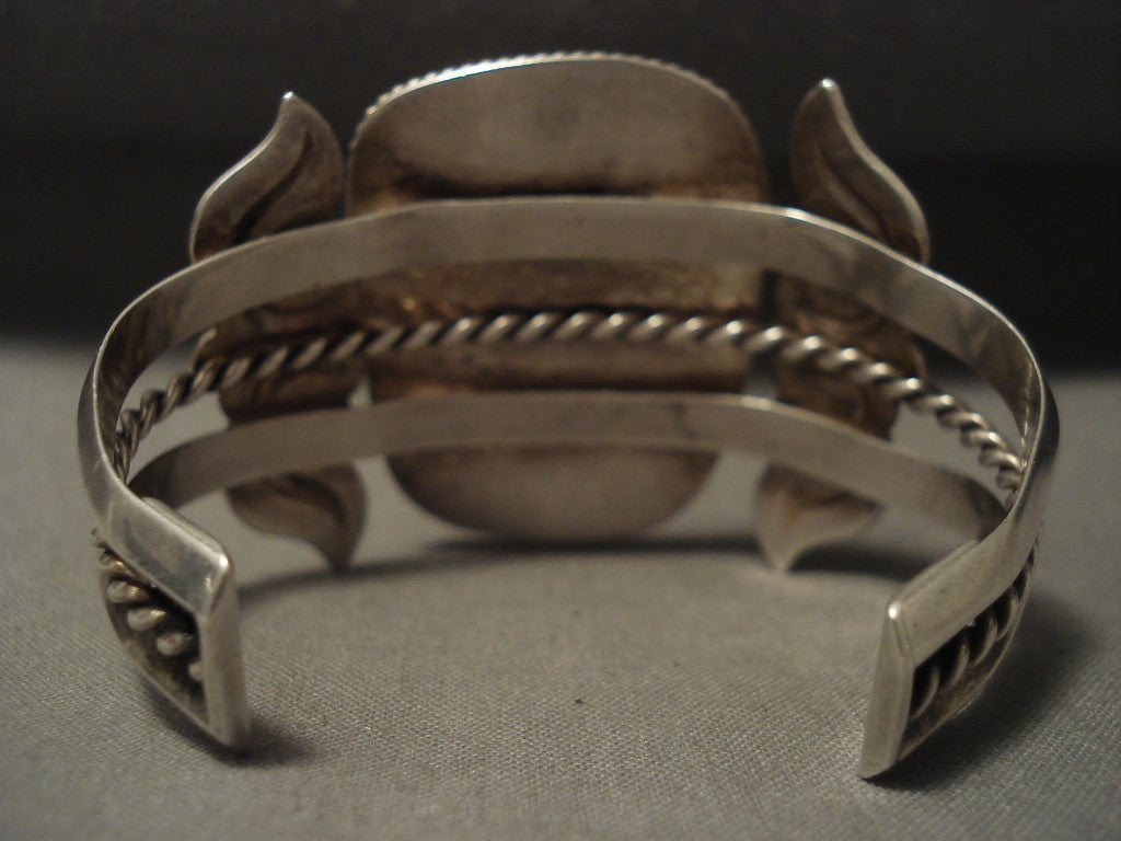 This is an impressive vintage Navajo museum quality silver bracelet having amazing advanced silver works. The silver works include marvelous hand repoussed silver flanks. Situated in between the flanks is a huge blue turquoise stone. This incredible bracelet contains a triple silver shank cuff with the center being wonderfully hand twisted. The height at the center of the bracelet measures around 1-3/4" while the width at the center of the cuff measures around 7/8". The center stone measures around 1-5/8" x 1-1/4". Signed by Navajo artist, George . Sterling silver, marked. Cir. 1970's+. The inside end to end measures around 5-1/4" with an additional 1-1/4" gap. Sturdy 50 grams. LAYAWAYS- We are happy to work with you and are more flexible than anyone on the net. Simply send us an email for more information.Make Us an Offer- Due to the high demand of our items, many pieces sell quite fast. The most frequent email we receive are from buyers who waited too long to make us an offer and suddenly lost out because another buyer came in and purchased. Send us your reasonable offer today, we are flexible and you have nothing to lose! We also have layaway available and are happy to work with you. Send us an email for more details. Ahéhee’ (Thank you)