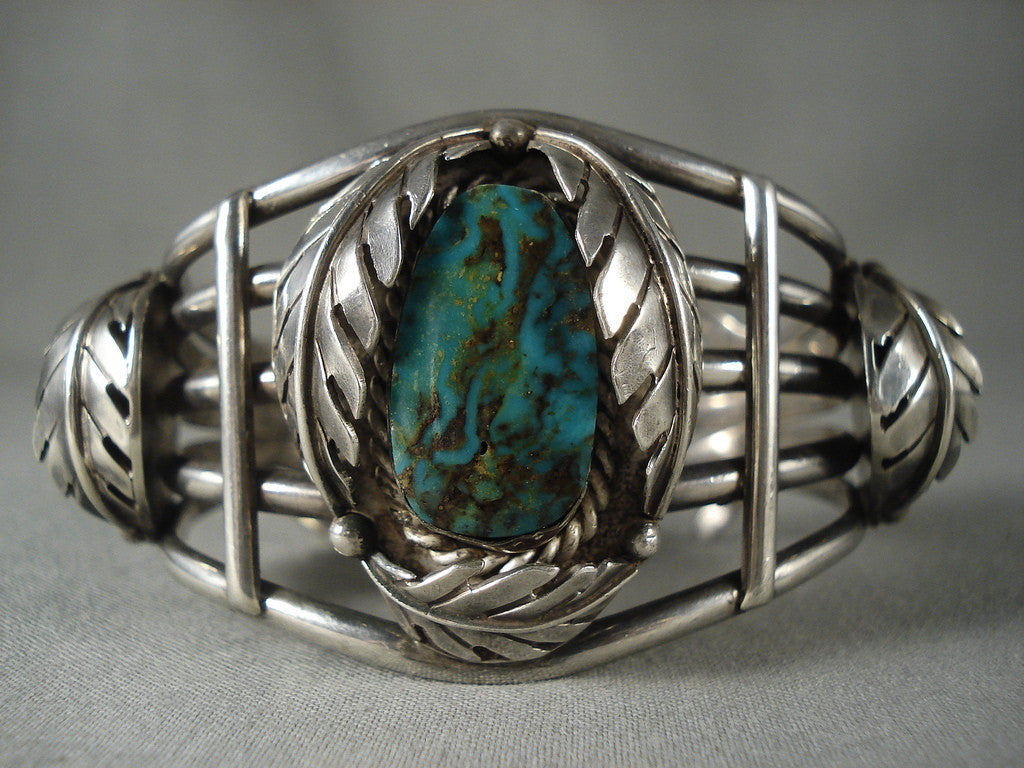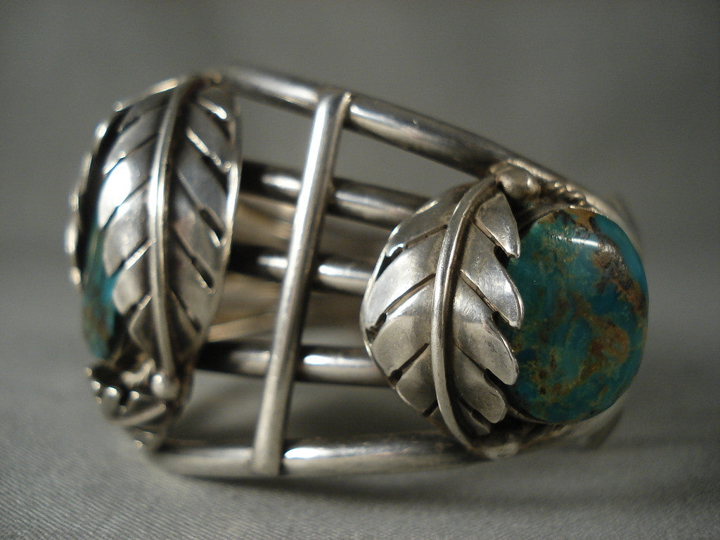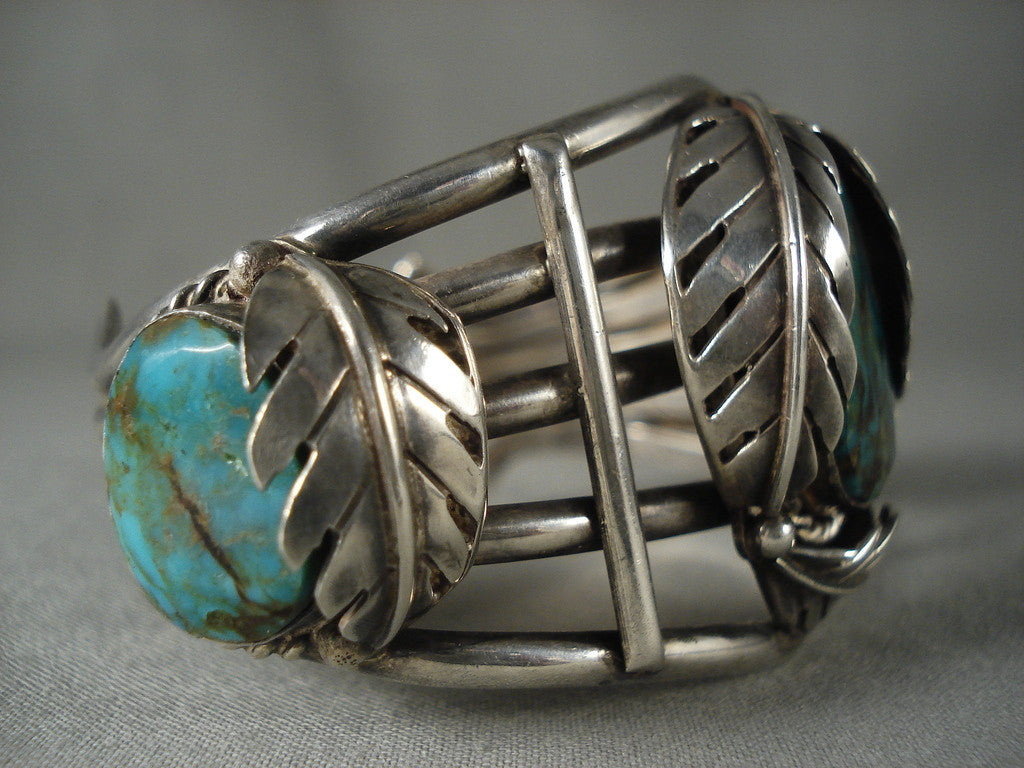 We are proud to offer this fascinating vintage Navajo silver bracelet. Each of these three vibrant Royston turquoise stones is more breathtaking than the next - as they're nestled safely within their homes of silver rope, silver applique leaves and berries. Each of the three stations is placed upon the five split silver rails with silver bar separators - then in a quite rare design, they feather out at the terminals to become embracing hands! Awesome! The largest stone measures around 15/16" x 1/2". The width of the bracelet measures around 1-5/8". Signed by Navajo artist, Torraco. Sterling silver. Cir. 1960's+. The inside end to end measures around 5-1/4" with an additional 1-1/4" gap. Sturdy 68 grams. LAYAWAYS- We are happy to work with you and are more flexible than anyone on the net. Simply send us an email for more information.Make Us an Offer- Due to the high demand of our items, many pieces sell quite fast. The most frequent email we receive are from buyers who waited too long to make us an offer and suddenly lost out because another buyer came in and purchased. Send us your reasonable offer today, we are flexible and you have nothing to lose! We also have layaway available and are happy to work with you. Send us an email for more details. Ahéhee’ (Thank you)