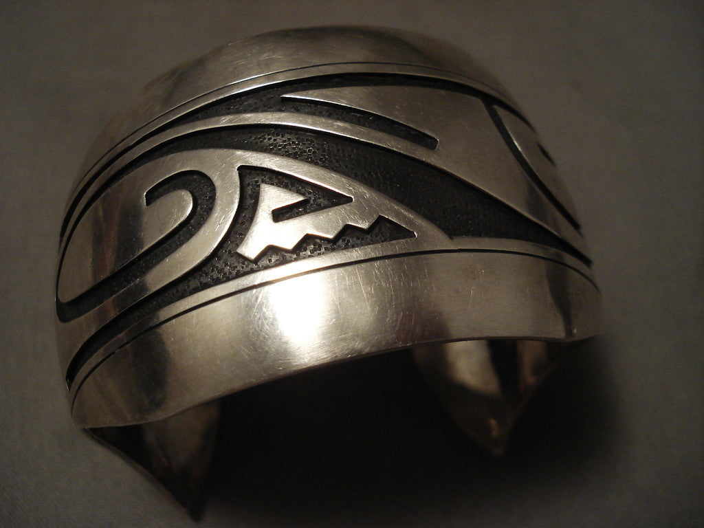 This is a remarkable vintage Navajo all silver wave bracelet. This amazing geometric piece contains a beautiful wide hand wrought sterling silver cuff that is very uniquely shaped. This bracelet consists of the IHSS hallmark which stands for Indian handmade sterling silver. The width of the bracelet measures around 1-1/2". Signed by Navajo artist, Hy Craig . Sterling silver, marked. The inside end to end measures around 6" with an additional 1" gap. Sturdy 56 grams. LAYAWAYS- We are happy to work with you and are more flexible than anyone on the net. Simply send us an email for more information.