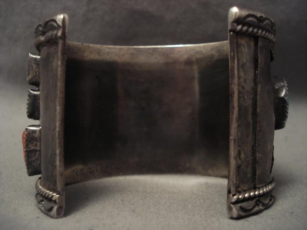 This is a tremendous vintage Navajo museum quality Shiprock silver bracelet being very large and containing an absolutely stunning hand cut design of the sacred Shiprock mountain. Shiprock is located in the Four Corners region, it is an absolutely beautiful mountain. (Please go to Google and see pictures of Shiprock if you are not familiar with this beautiful site). This bracelet consists of a collection of Old Kingman turquoise stone with accenting abolone shell, coral and a center gargantuan agate stone. This bracelet consists of a heavy natural patina silver cuff. The center stone measures around 1-1/8" x 7/8". The width of the bracelet measures around 1-7/8". Sterling silver. The inside end to end measures around 5-3/4" with an additional 1-1/4" gap. Sturdy 103 grams. MAKE US AN OFFER- We like to be flexible! Send us your reasonable offer on this piece(s), you have nothing to lose. The most common email we receive is from buyers who waited too long and someone bought it before they did. LAYAWAYS- Please contact us prior to purchasing and we can work out an easy 0%-interest Paypal/ Money Order lay-a-way plan that fits your budget. (Item must be of $100 value or more).