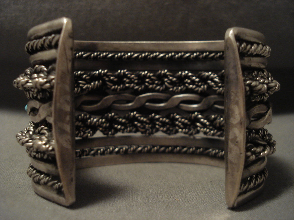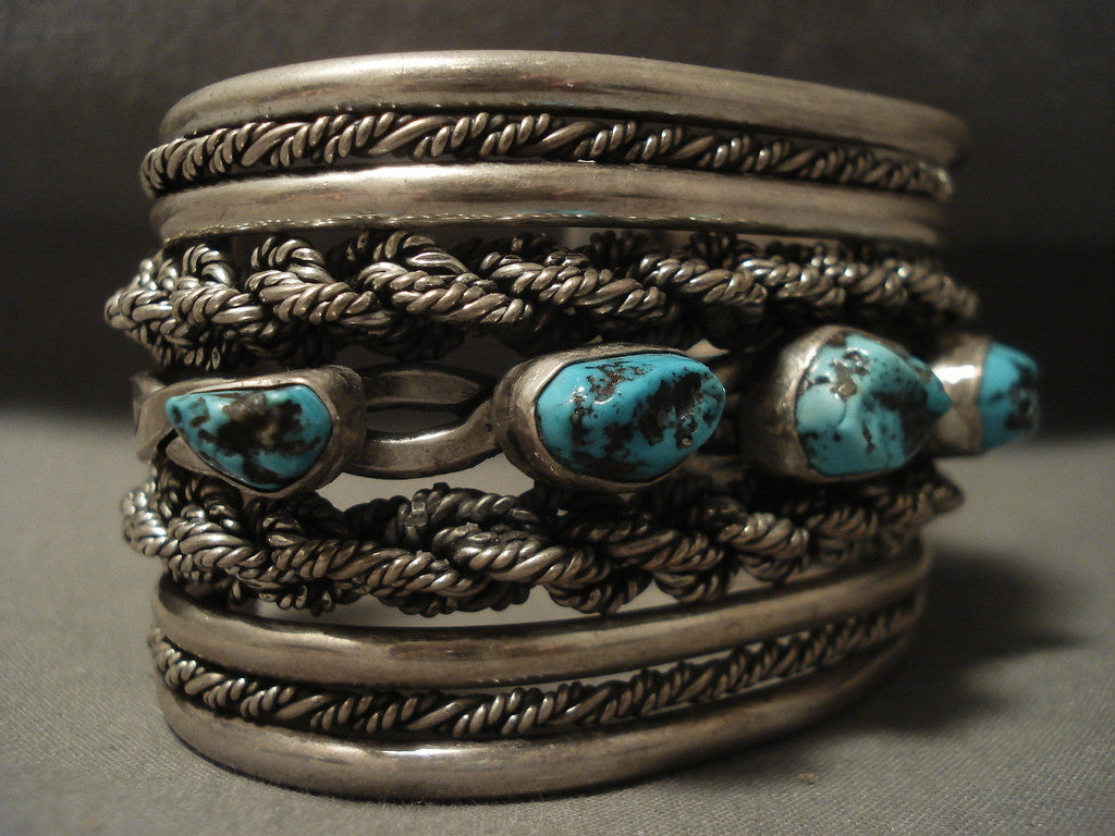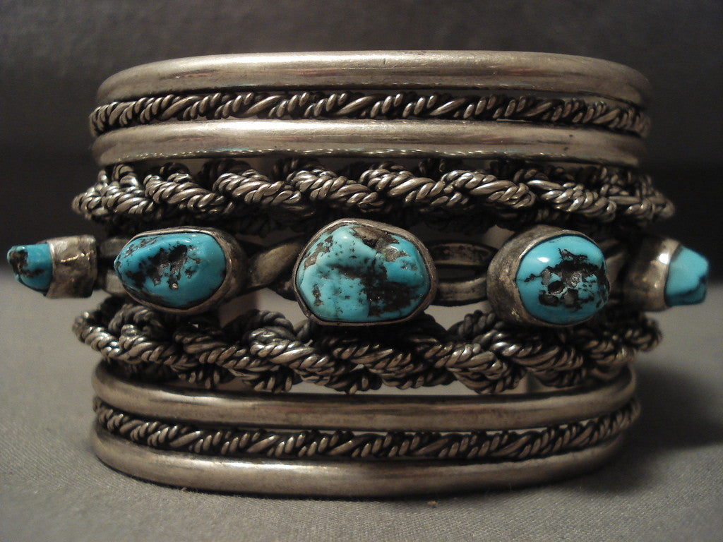 This is an incredible vintage Navajo museum quality gigantic old silver coil bracelet. This piece consists of a plethora of advanced silver works that include phenomenal hand woven silver shanks. Resting down the center of the bracelet are five outstanding old Persian turquoise stones. This piece is absolutely amazing. The center stone measures around 1/2" x 3/8". The width of the bracelet measures around 1-3/4". Sterling silver. The inside end to end measures around 5-1/2" with an additional 1-1/2" gap. Sturdy 142 grams. LAYAWAYS- We are happy to work with you and are more flexible than anyone on the net. Simply send us an email for more information.