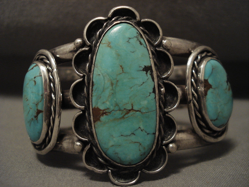 This is an astonishing vintage Navajo earlier silver bracelet having three huge spiderweb turquoise stones. The stones appear to have originated from the marvelous Crow Springs turquoise mine in Nevada. Crow Springs is a rare mine. Accenting the large center turquoise are incredible silver waving patterns with accenting silver ropes and beads. Bordering the two outer stones are more impeccable silver ropes with solid sterling silver segments. This bracelet consists of a wonderful heavy and thick triple silver shank cuff. The center stone measures around 1-1/2" x 3/4". The width of the bracelet measures around 1-1/4". Sterling silver. The inside end to end measures around 5-3/4" with an additional 1-1/4" gap. Sturdy 73 grams. LAYAWAYS- We are happy to work with you and are more flexible than anyone on the net. Simply send us an email for more information.Make Us an Offer- Due to the high demand of our items, many pieces sell quite fast. The most frequent email we receive are from buyers who waited too long to make us an offer and suddenly lost out because another buyer came in and purchased. Send us your reasonable offer today, we are flexible and you have nothing to lose! We also have layaway available and are happy to work with you. Send us an email for more details. Ahéhee’ (Thank you)