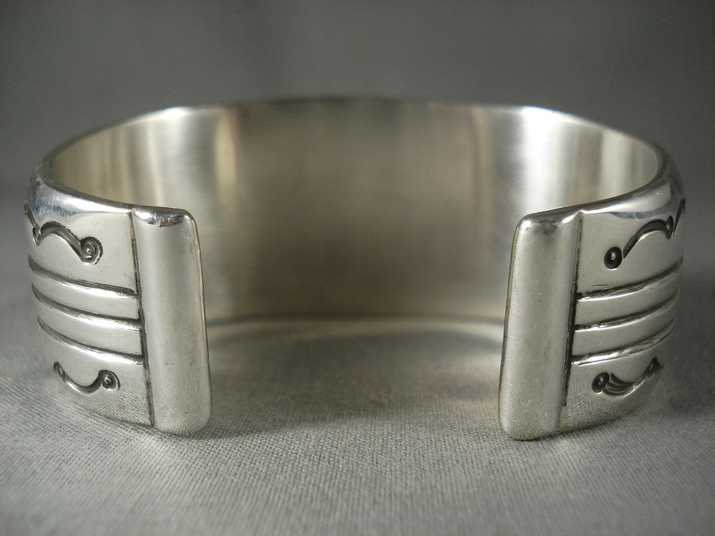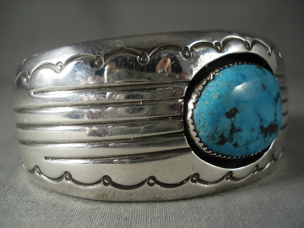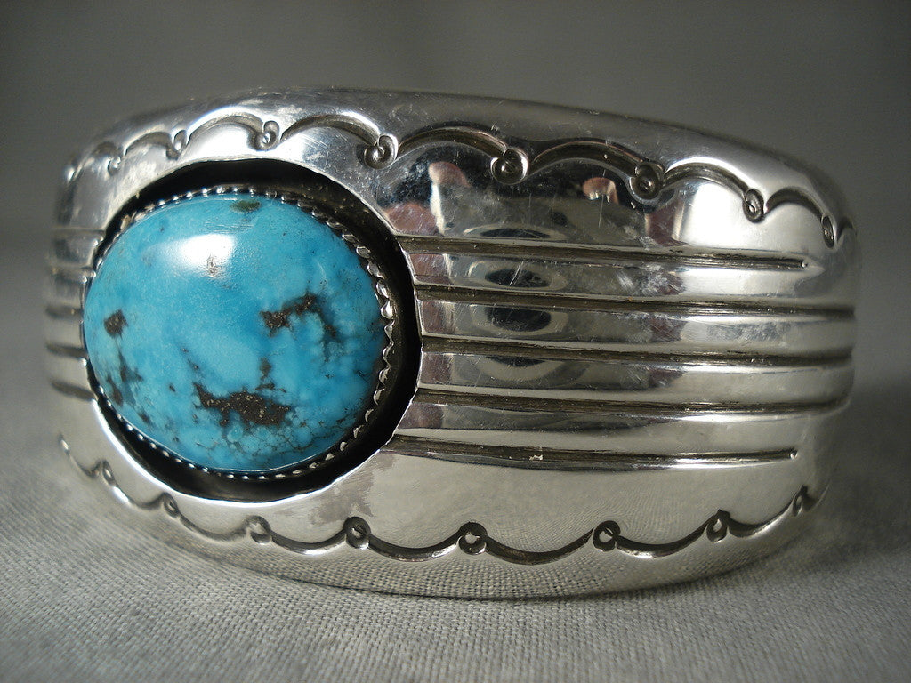This is an impressive vintage Navajo silver bracelet. The dramatic Blue Diamond turquoise stone is horizontally deep set in the center of the cuff as five deep cut horizontals continue the theme as they radiate from the sides. The high polish silver bracelet tapers gently as the five horizontals become three to the terminals of silver bars. And bordering above and below the entire bracelet are hand stamped canopy designs. The center stone measures around 1" x 5/8". The width of the bracelet measures around 1-1/4". Signed by Navajo artist, Jene Jackson. Sterling silver, marked. Cir. 1990's+. The inside end to end measures around 5-3/4" with an additional 1" gap. Sturdy 72 grams. LAYAWAYS- We are happy to work with you and are more flexible than anyone on the net. Simply send us an email for more information.Make Us an Offer- Due to the high demand of our items, many pieces sell quite fast. The most frequent email we receive are from buyers who waited too long to make us an offer and suddenly lost out because another buyer came in and purchased. Send us your reasonable offer today, we are flexible and you have nothing to lose! We also have layaway available and are happy to work with you. Send us an email for more details. Ahéhee’ (Thank you)