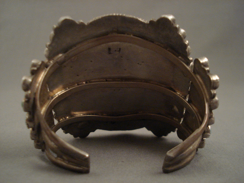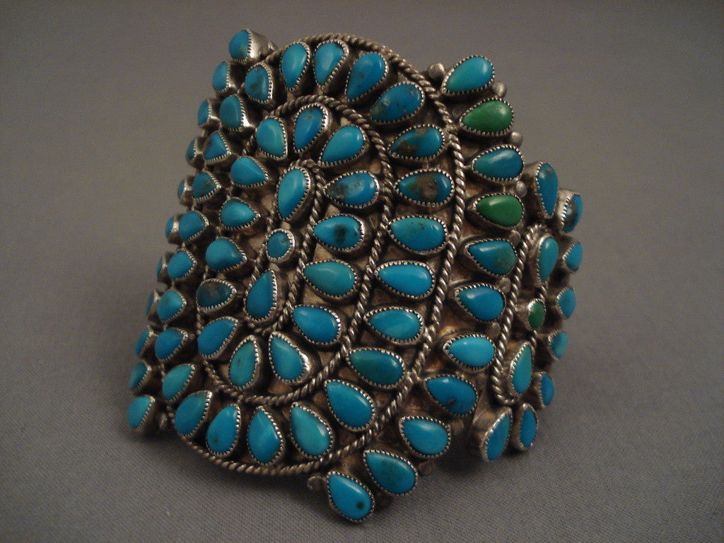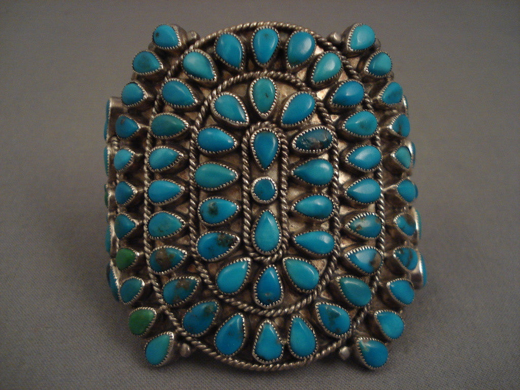 Up for sale is this stunning vintage Navajo silver bracelet having Bisbee and Old Kingman turquoise teardrop cluster and matching half moon cluster flanks on a handcarved triple silver cuff! Handcarved silver rope in between the rows of turquoise teardrops accent this unique piece beautifully! The stones measure around 1/4" x 1/8". The width of the bracelet measures around 2-1/2". Signed by Navajo artist, Les Holden. Sterling silver. Cir. 1980's+. The inside end to end measures around 5" with an additional 1-1/4" gap. Sturdy 76 grams. MAKE US AN OFFER- We like to be flexible! Send us your reasonable offer on this piece(s), you have nothing to lose. The most common email we receive is from buyers who waited too long and someone bought it before they did. LAYAWAYS- Please contact us prior to purchasing and we can work out an easy 0%-interest Paypal/ Money Order lay-a-way plan that fits your budget. (Item must be of $100 value or more).