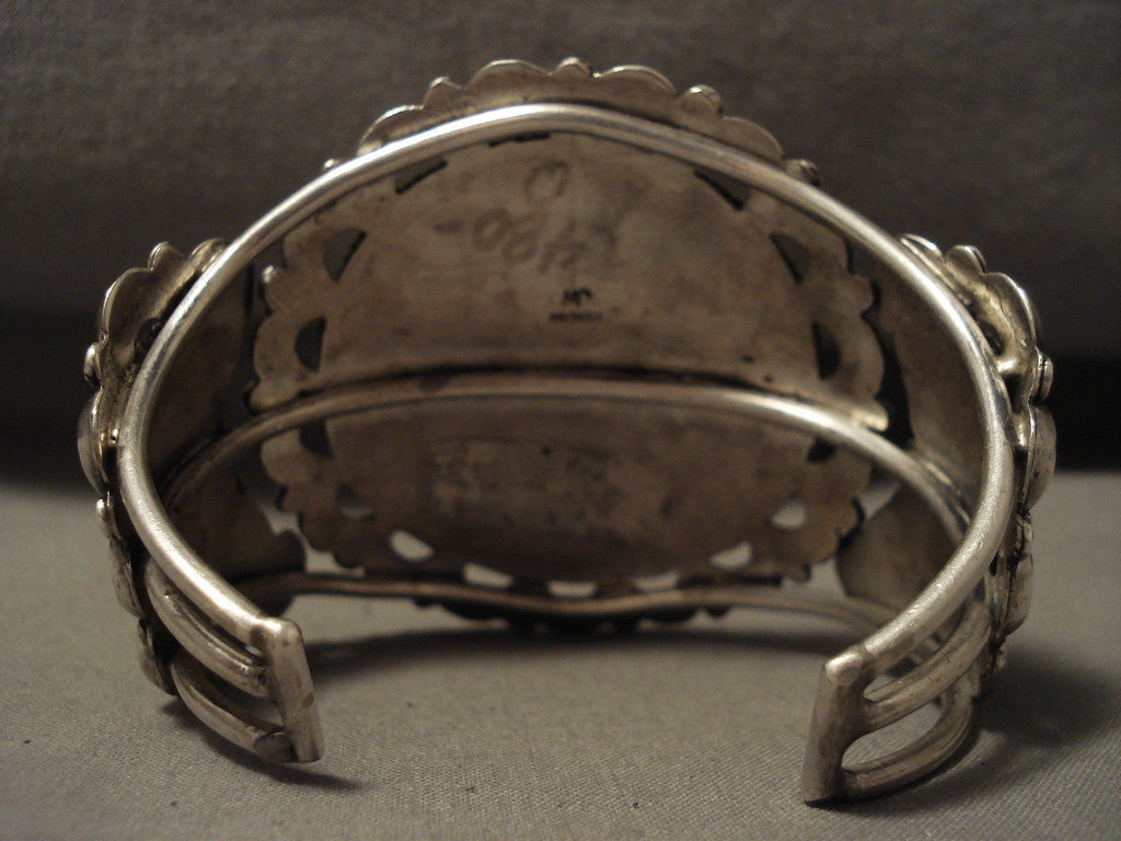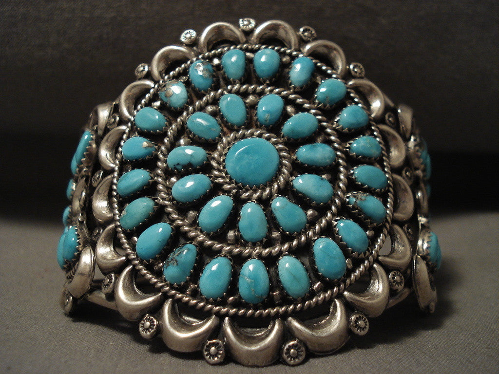 This is an astonishing vintage Navajo silver bracelet having an plethora of beautiful light blue turquoise stones. Surrounding the stones are marvelous hand repoussed silver patterns with accenting silver shells, raindrops and ropes. The impressive and natural high grade turquoise appears to be old Morenci. This bracelet includes a wonderful rounded triple silver shank cuff. The center stone measures around 3/8" x 3/8". The width of the bracelet measures around 2-1/4". Signed by Navajo artist, Jerry Begay . Sterling silver, marked. Cir. 1970's+. The inside end to end measures around 5-1/2" with an additional 1-1/4" gap. Sturdy 77 grams. LAYAWAYS- We are happy to work with you and are more flexible than anyone on the net. Simply send us an email for more information.Make Us an Offer- Due to the high demand of our items, many pieces sell quite fast. The most frequent email we receive are from buyers who waited too long to make us an offer and suddenly lost out because another buyer came in and purchased. Send us your reasonable offer today, we are flexible and you have nothing to lose! We also have layaway available and are happy to work with you. Send us an email for more details. Ahéhee’ (Thank you)