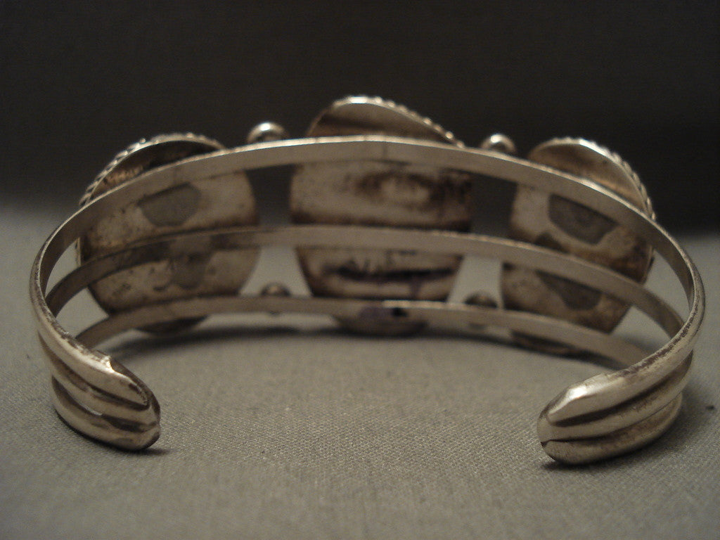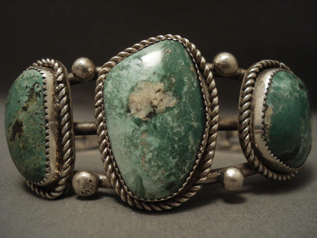 This is a remarkable vintage Navajo museum quality old silver bracelet. This piece contains three marvelous green turquoise stones that appear to be green varascite. Surrounding the stones are stunning silver raindrops with beautiful silver ropes. This bracelet includes a wonderful triple silver shank cuff. The center stone measures around 1-1/4" x 3/4". The width of the bracelet measures around 1". Signed by Navajo artist, (A within a V). Sterling silver, marked. Cir. 1960's+. The inside end to end measures around 5-3/4" with an additional 1-1/4" gap. Sturdy 48 grams. LAYAWAYS- We are happy to work with you and are more flexible than anyone on the net. Simply send us an email for more information.Make Us an Offer- Due to the high demand of our items, many pieces sell quite fast. The most frequent email we receive are from buyers who waited too long to make us an offer and suddenly lost out because another buyer came in and purchased. Send us your reasonable offer today, we are flexible and you have nothing to lose! We also have layaway available and are happy to work with you. Send us an email for more details. Ahéhee’ (Thank you)
