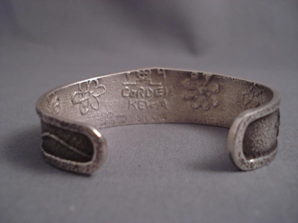 This is an impressive vintage Santo Domingo silver bracelet. The tufa casting of the dragonflies and floral designs is deep set. The interior has more intricate florals. The width of the bracelet measures around 7/8". Santo Domingo Cordell Pajarito. Sterling silver, marked. Cir. 1980's+. The inside end to end measures around 5-1/4" with an additional 1" gap. Sturdy 29 grams. MAKE US AN OFFER- We like to be flexible! Send us your reasonable offer on this piece(s), you have nothing to lose. The most common email we receive is from buyers who waited too long and someone bought it before they did. LAYAWAYS- Please contact us prior to purchasing and we can work out an easy 0%-interest Paypal/ Money Order lay-a-way plan that fits your budget. (Item must be of $100 value or more).