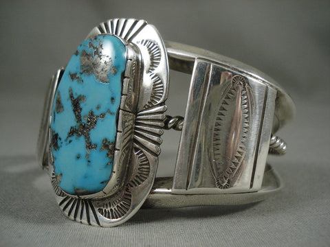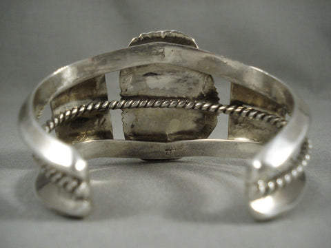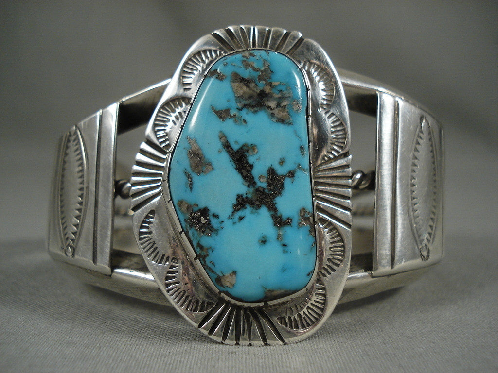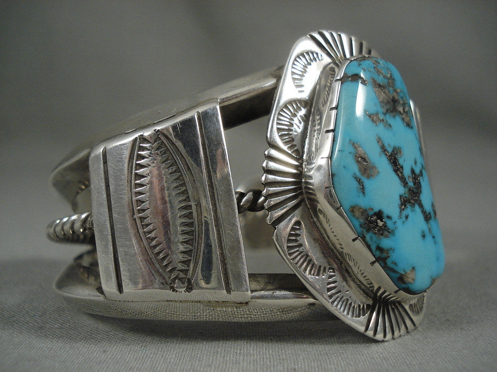This is an exceptional vintage Santo Domingo silver bracelet. The huge vibrant Persian turquoise stone is marvelously framed with a wide silver border of stamped sunrises nestled between the deep north, south, east and west sunrays. The sides are flanked with silver platforms with hand stamped clouds. And the cuff consists of double light-reflecting beveled silver rails with a center silver rope rail. Simply stunning! The center stone measures around 1-1/4" x 5/8". The width of the bracelet measures around 1-3/4". Signed by Santo Domingo artist Howard Tenorio. Sterling silver, marked. Cir. 1980's+. The inside end to end measures around 5-5/8" with an additional 1-1/8" gap. Sturdy 78 grams. LAYAWAYS- We are happy to work with you and are more flexible than anyone on the net. Simply send us an email for more information.Make Us an Offer- Due to the high demand of our items, many pieces sell quite fast. The most frequent email we receive are from buyers who waited too long to make us an offer and suddenly lost out because another buyer came in and purchased. Send us your reasonable offer today, we are flexible and you have nothing to lose! We also have layaway available and are happy to work with you. Send us an email for more details. Ahéhee’ (Thank you)