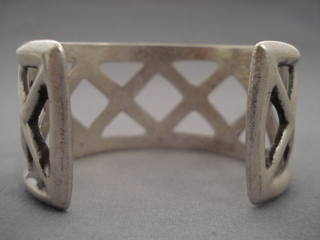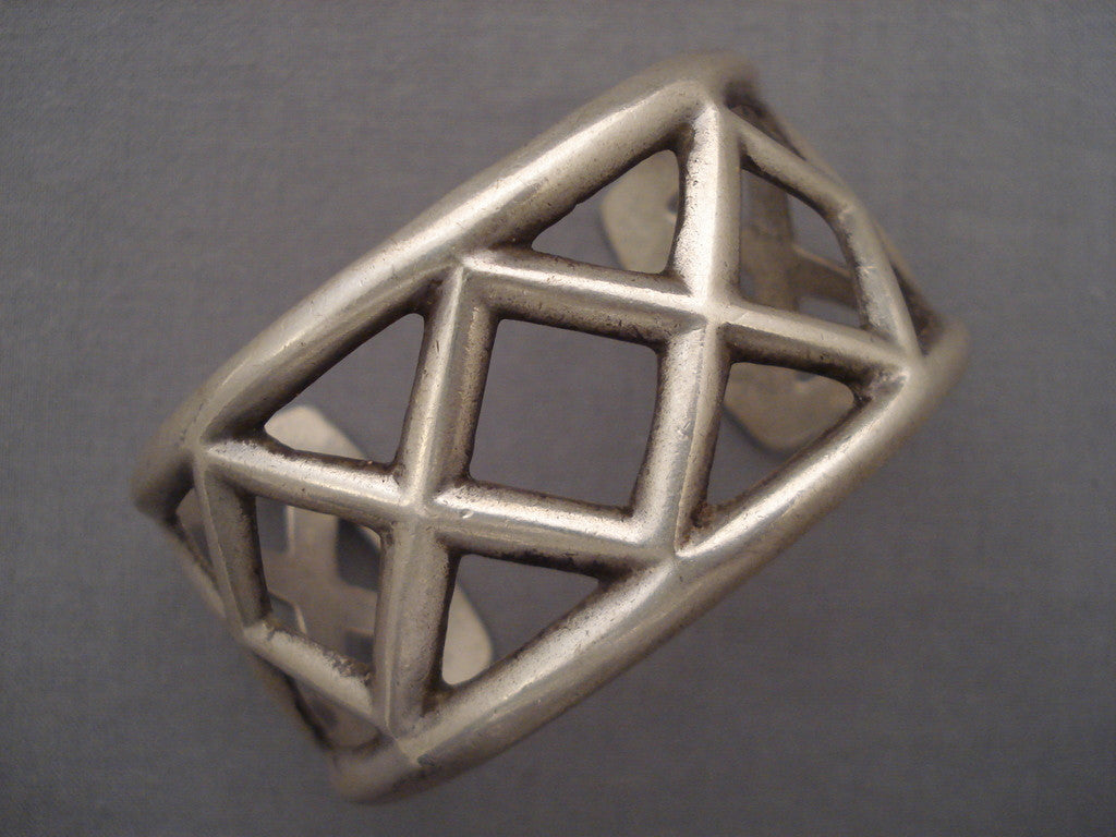 Up for sale is this stunning vintage Navajo silver cast bracelet having a handcarved cut out diamond pattern across the entire silver cuff with solid silver borders! Very Unique! The width of the bracelet measures around 1-1/4". Signed by Navajo artist, Singer style. Sterling silver. Cir. 1970's+. The inside end to end measures around 5-1/4" with an additional 1-1/4" gap. Sturdy 59 grams. LAYAWAYS- We are happy to work with you and are more flexible than anyone on the net. Simply send us an email for more information.Make Us an Offer- Due to the high demand of our items, many pieces sell quite fast. The most frequent email we receive are from buyers who waited too long to make us an offer and suddenly lost out because another buyer came in and purchased. Send us your reasonable offer today, we are flexible and you have nothing to lose! We also have layaway available and are happy to work with you. Send us an email for more details. Ahéhee’ (Thank you)