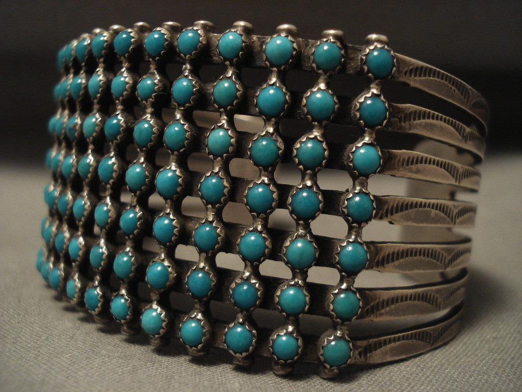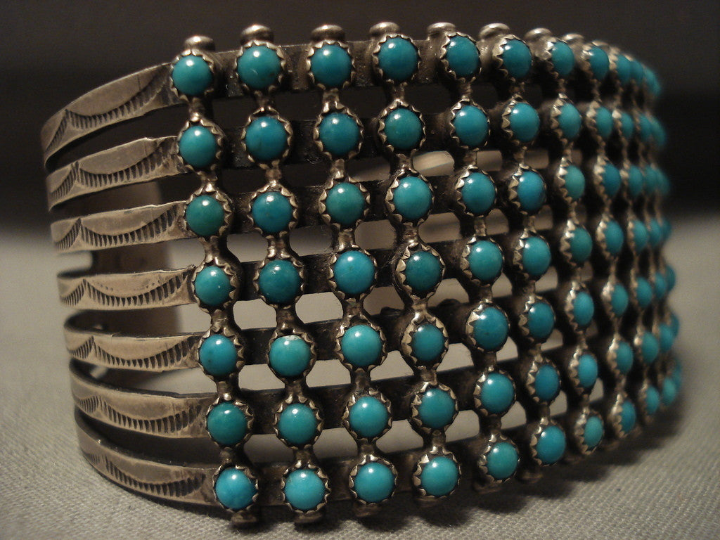 This is a remarkable vintage Zuni/ Navajo petit point, snake eye, turquoise row bracelet. This amazing piece contains 7 rows of fabulous blue turquoise petit point stones, a total of 98 beautiful stones. Surrounding the stones are wonderful silver raindrops. This bracelet consists of a 7 silver shank cuff with outstanding silver sun works that run down the ends. The width of the bracelet measures around 1-3/8". Signed by Zuni/ Navajo artist H.S. (unqiue font). Sterling silver, marked. Cir. 1960's+. The inside end to end measures around 5-1/2" with an additional 1" gap. Sturdy 52 grams. LAYAWAYS- We are happy to work with you and are more flexible than anyone on the net. Simply send us an email for more information.