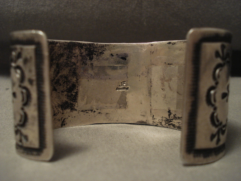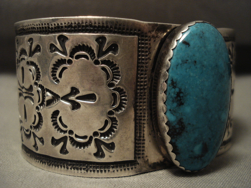 This is a magnificent vintage Navajo silver bracelet. This piece contains a phenomenal center dome shaped blue turquoise stone that may have originated from the impeccable Blue Diamond turquoise mine. Resting on the ends of the cuff are intricate sun silver works with outstanding micro dotted patterns that wonderfully surround the cuff. The center stone measures around 1-3/8" x 3/4". The width of the bracelet measures around 1-3/8". Signed by Navajo artist, Jo Frank . Sterling silver, marked. Cir. 1970's+. The inside end to end measures around 6" with an additional 1-1/4" gap. Sturdy 79 grams. LAYAWAYS- We are happy to work with you and are more flexible than anyone on the net. Simply send us an email for more information.Make Us an Offer- Due to the high demand of our items, many pieces sell quite fast. The most frequent email we receive are from buyers who waited too long to make us an offer and suddenly lost out because another buyer came in and purchased. Send us your reasonable offer today, we are flexible and you have nothing to lose! We also have layaway available and are happy to work with you. Send us an email for more details. Ahéhee’ (Thank you)