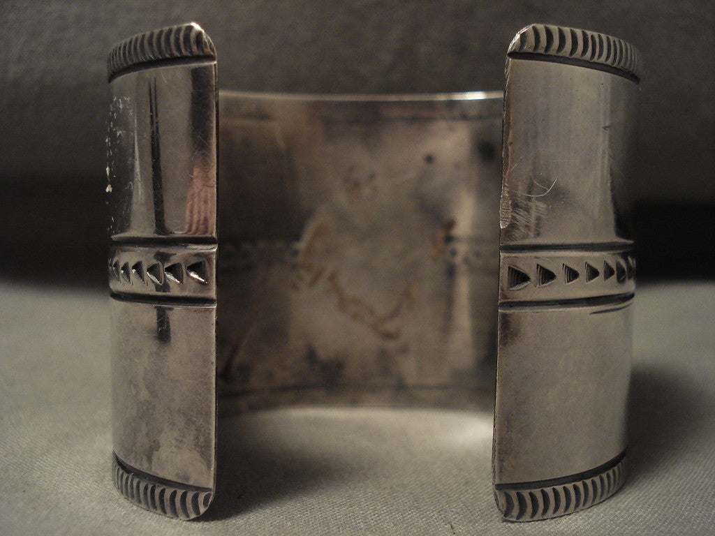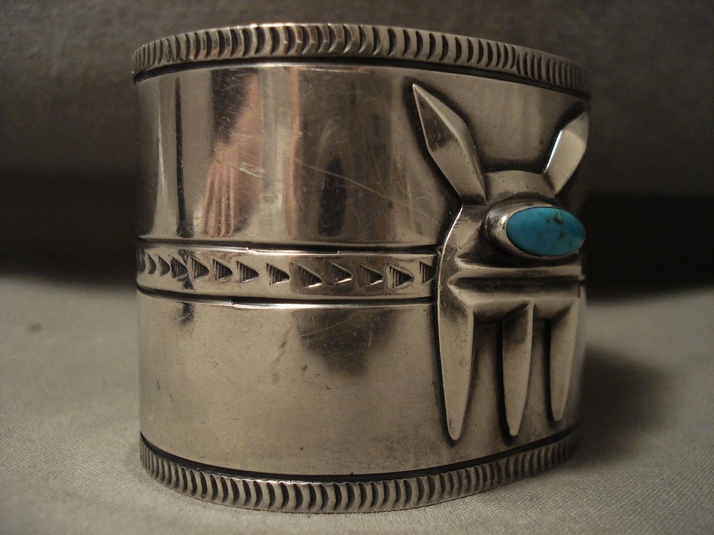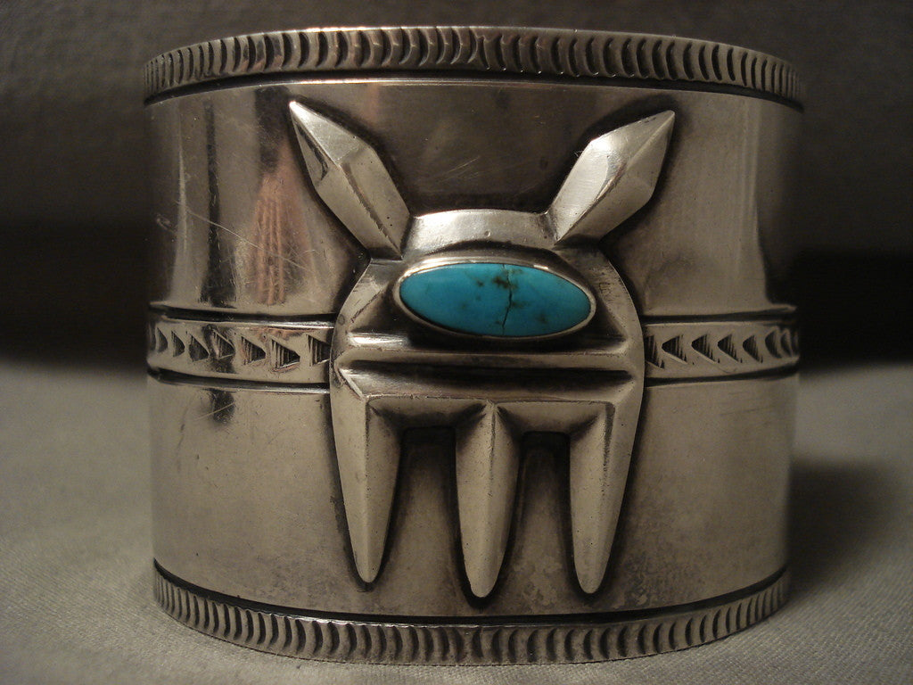 This is an exceptional vintage Navajo super wide silver cuff bracelet. This museum quality sacred animal silver bracelet is very old and contains incredibly intricate chiseled silver works. Resting in the wonderful sacred animal is a stunning Blue Gem turquoise stone. The center stone measures around 1/2" x 3/16". The width of the bracelet measures around 1-7/8". Sterling silver. Cir. 1930's+. The inside end to end measures around 5-3/4" with an additional 1" gap. Sturdy 65 grams. LAYAWAYS- We are happy to work with you and are more flexible than anyone on the net. Simply send us an email for more information.Make Us an Offer- Due to the high demand of our items, many pieces sell quite fast. The most frequent email we receive are from buyers who waited too long to make us an offer and suddenly lost out because another buyer came in and purchased. Send us your reasonable offer today, we are flexible and you have nothing to lose! We also have layaway available and are happy to work with you. Send us an email for more details. Ahéhee’ (Thank you)