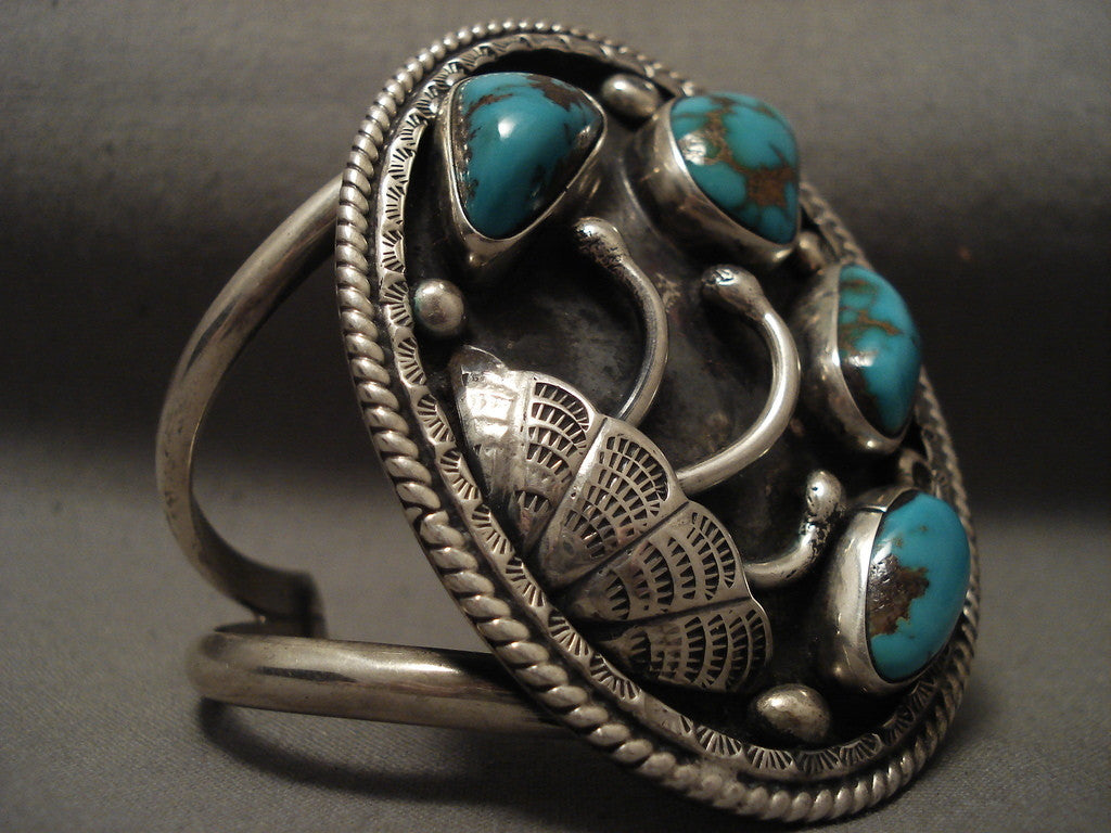 This is a striking vintage Navajo museum qualtiy silver bracelet. Check out the four turquoise stones that appear to be from the incredible natural old Blue Gem turquoise mine. I cannot get over how deep blue in coloration these stones have. Located throughout the stones are amazing silver fans, stems and raindrops. The bracelet consists of a superior double silver shank cuff. The largest stone measures around 3/4" x 1/2". The width of the bracelet measures around 2-1/8". Sterling silver. Cir. Mid century . The inside end to end measures around 5-1/2" with an additional 1" gap. Sturdy 79 grams. LAYAWAYS- We are happy to work with you and are more flexible than anyone on the net. Simply send us an email for more information.