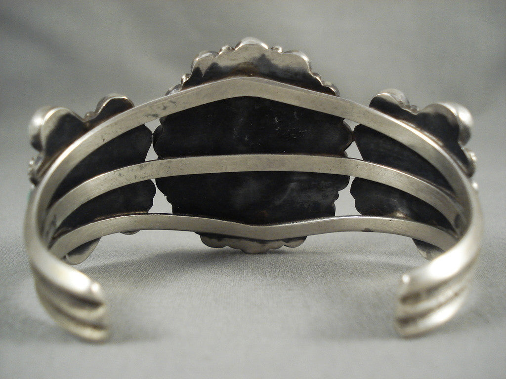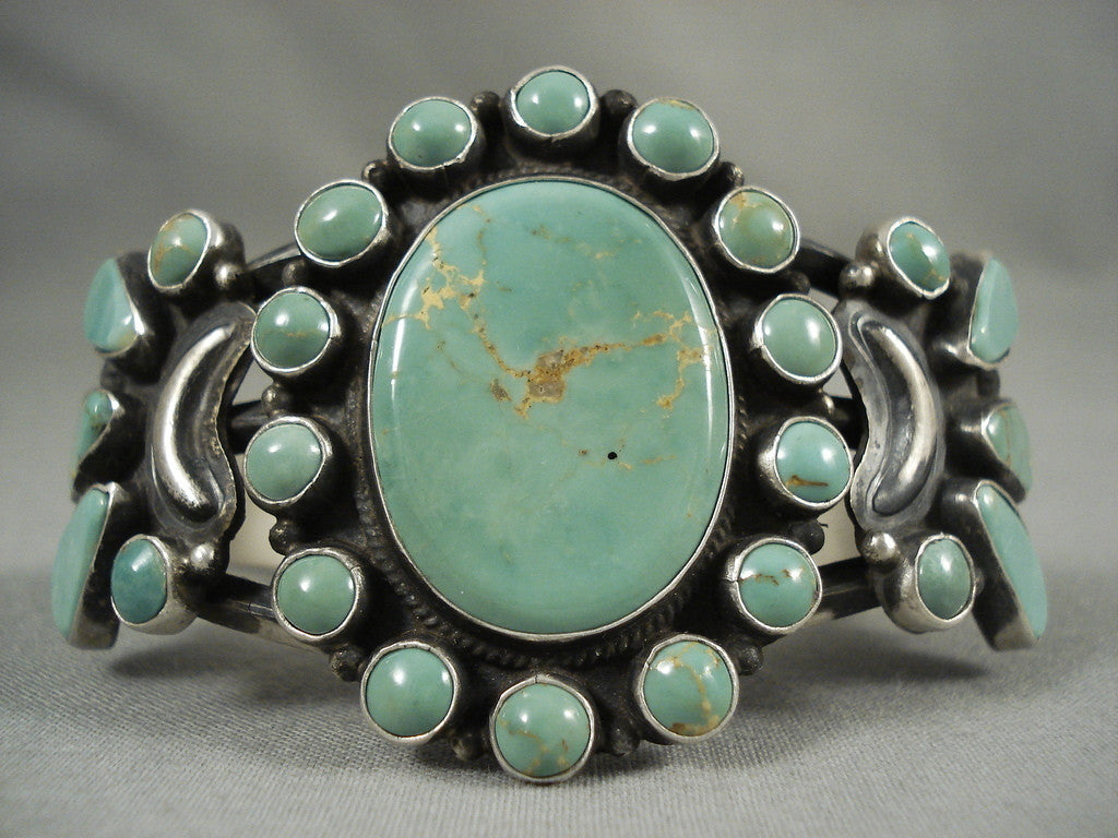 This is a stunning vintage Navajo silver bracelet. Large Royston turquoise teardrops and rounds gather around to pay homage to the massive oval grand Royston turquoise stone in the very center of this triple silver rail cuff. Separating and accenting the beautiful stones are silver stars, crescents and beads. The center stone measures around 1-1/8" x 7/8". The width of the bracelet measures around 1-3/4". Signed by Navajo artist, Dan Brown. Sterling silver, marked. Cir. 1990's+. The inside end to end measures around 5-1/4" with an additional 1-1/2" gap. Sturdy 48 grams. LAYAWAYS- We are happy to work with you and are more flexible than anyone on the net. Simply send us an email for more information.Make Us an Offer- Due to the high demand of our items, many pieces sell quite fast. The most frequent email we receive are from buyers who waited too long to make us an offer and suddenly lost out because another buyer came in and purchased. Send us your reasonable offer today, we are flexible and you have nothing to lose! We also have layaway available and are happy to work with you. Send us an email for more details. Ahéhee’ (Thank you)