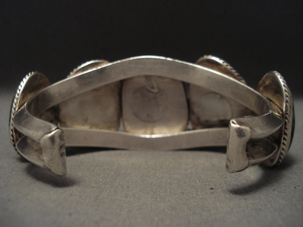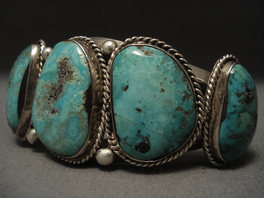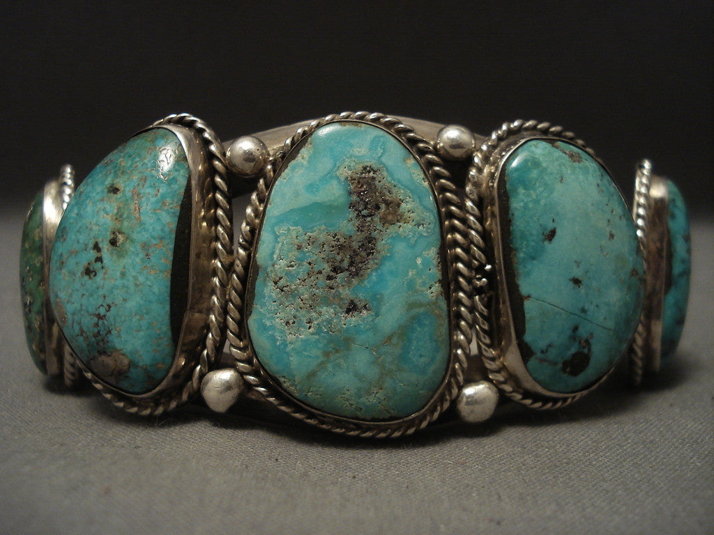 This is a monumental vintage Navajo silver bracelet containing 5 outstanding old Pilot Mountain turquoise stones. This bracelet is very thick and heavy containing two large triangular silver shanks. WOnderfully surrounding the stones are beautiful silver ropes. Accenting the center stone are four impressive silver raindrops. The center stone measures around 1-1/8" x 3/4". The width of the bracelet measures around 1-3/8". Artist Yazzie Family . Sterling silver. Cir. 1950's+. The inside end to end measures around 5-1/2" with an additional 1-1/4" gap. Sturdy 91 grams. MAKE US AN OFFER- We like to be flexible! Send us your reasonable offer on this piece(s), you have nothing to lose. The most common email we receive is from buyers who waited too long and someone bought it before they did. LAYAWAYS- Please contact us prior to purchasing and we can work out an easy 0%-interest Paypal/ Money Order lay-a-way plan that fits your budget. (Item must be of $100 value or more).